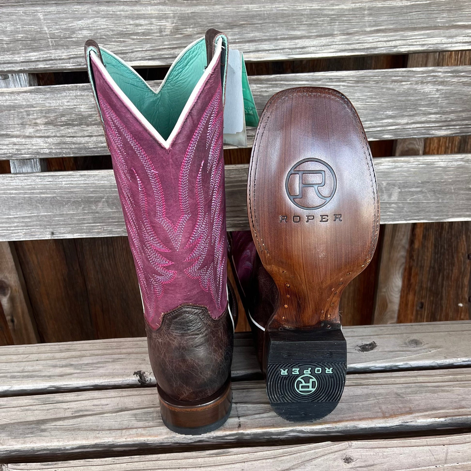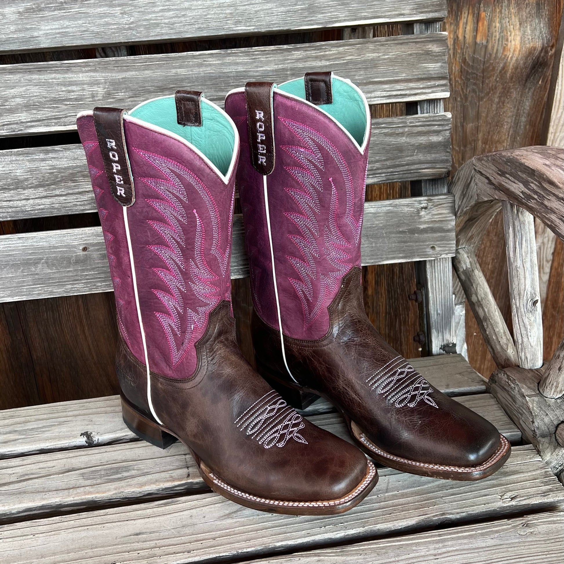 Women's Roper cowgirl boot square toe polishable brown leather vamp, burnish purple 11" shaft, double ¾ welt sole with nails, walking heel, leather outsole, reboot insole, handcrafted boot