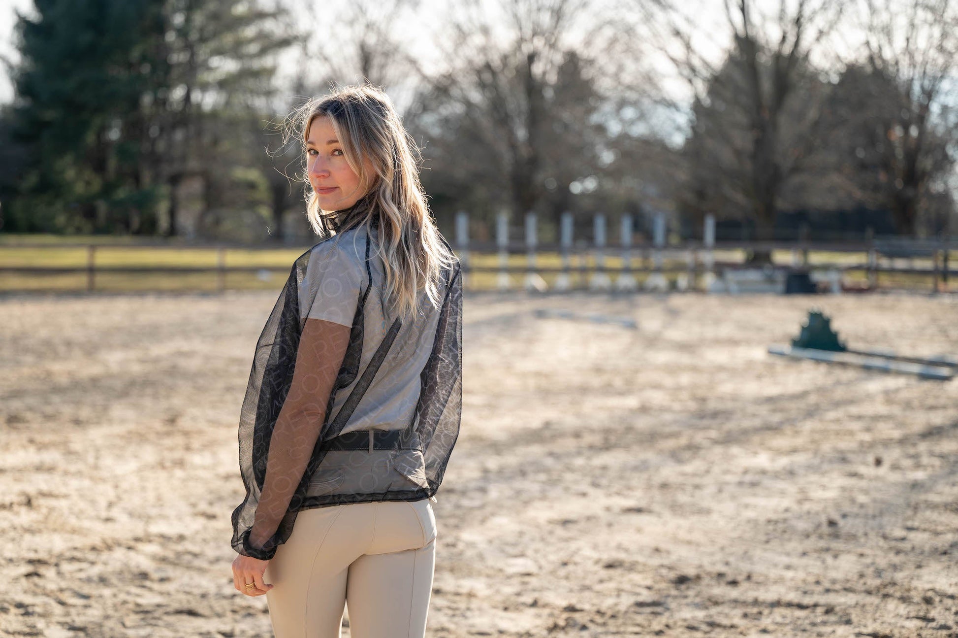 The Redingote Summer Scrim is your barely-there barrier against barnyard bugs, designed to keep you cool and comfortable all season long. Made from breathable sheer mesh in our subtle REDINGOTE logo print, it features a high neckline, zip front, and adjustable drawstring waist for a custom fit. Light, airy, and practical — you’ll forget you’re wearing it, but the bugs won’t.