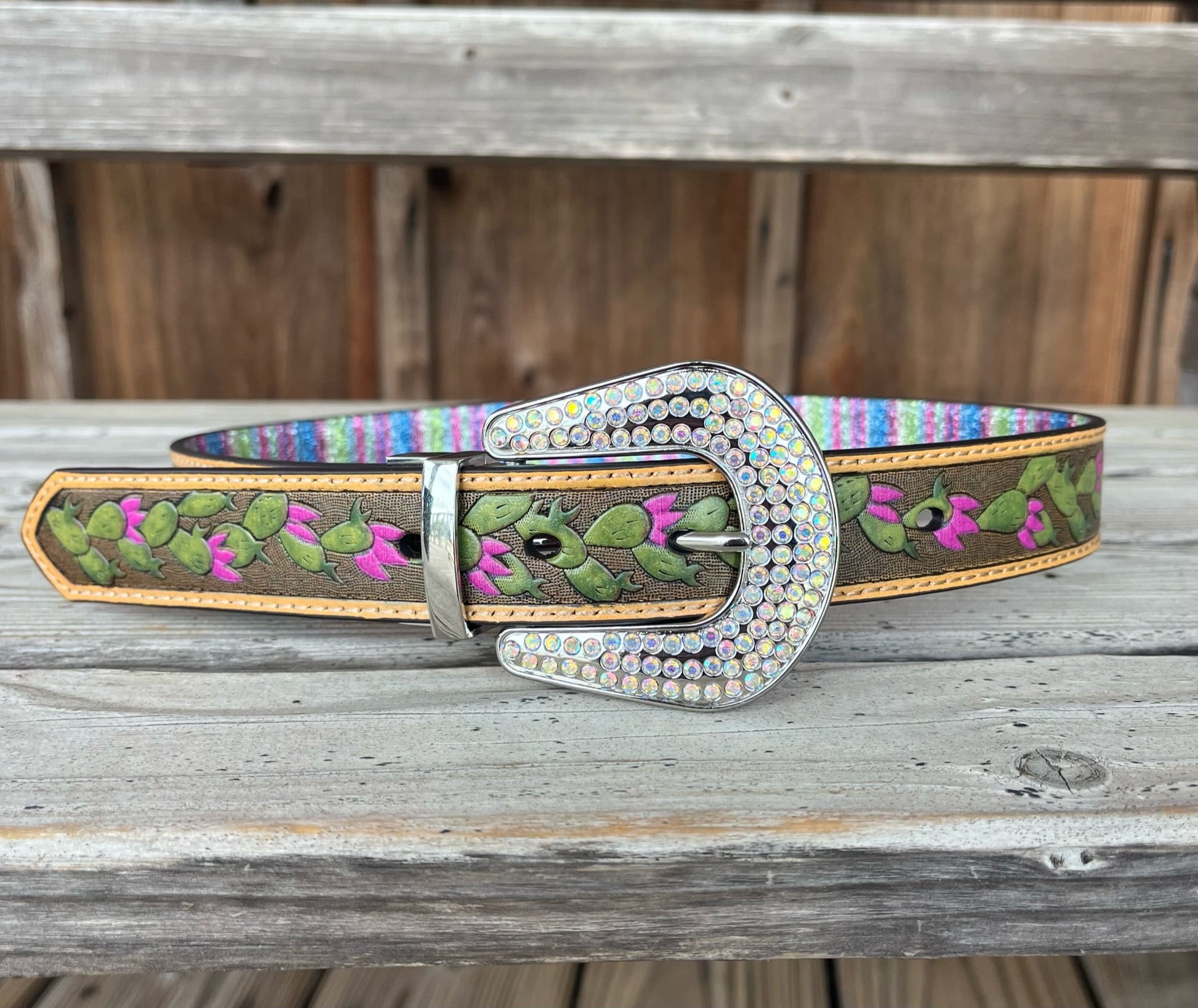 Angel Ranch girls reversible belt. Glitter stripes on one side and cactus tooling on the other