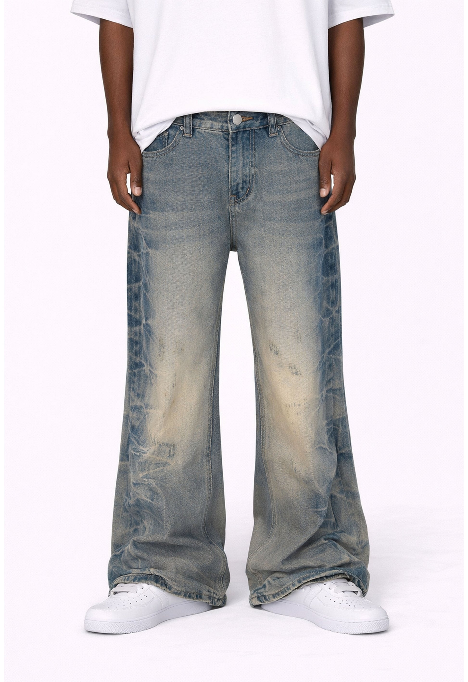 Our Ripple Flare Denim is designed with a relaxed fit, featuring heavyweight denim, a sand-washed distressed finish, and subtle fraying for a vintage, worn-in aesthetic.