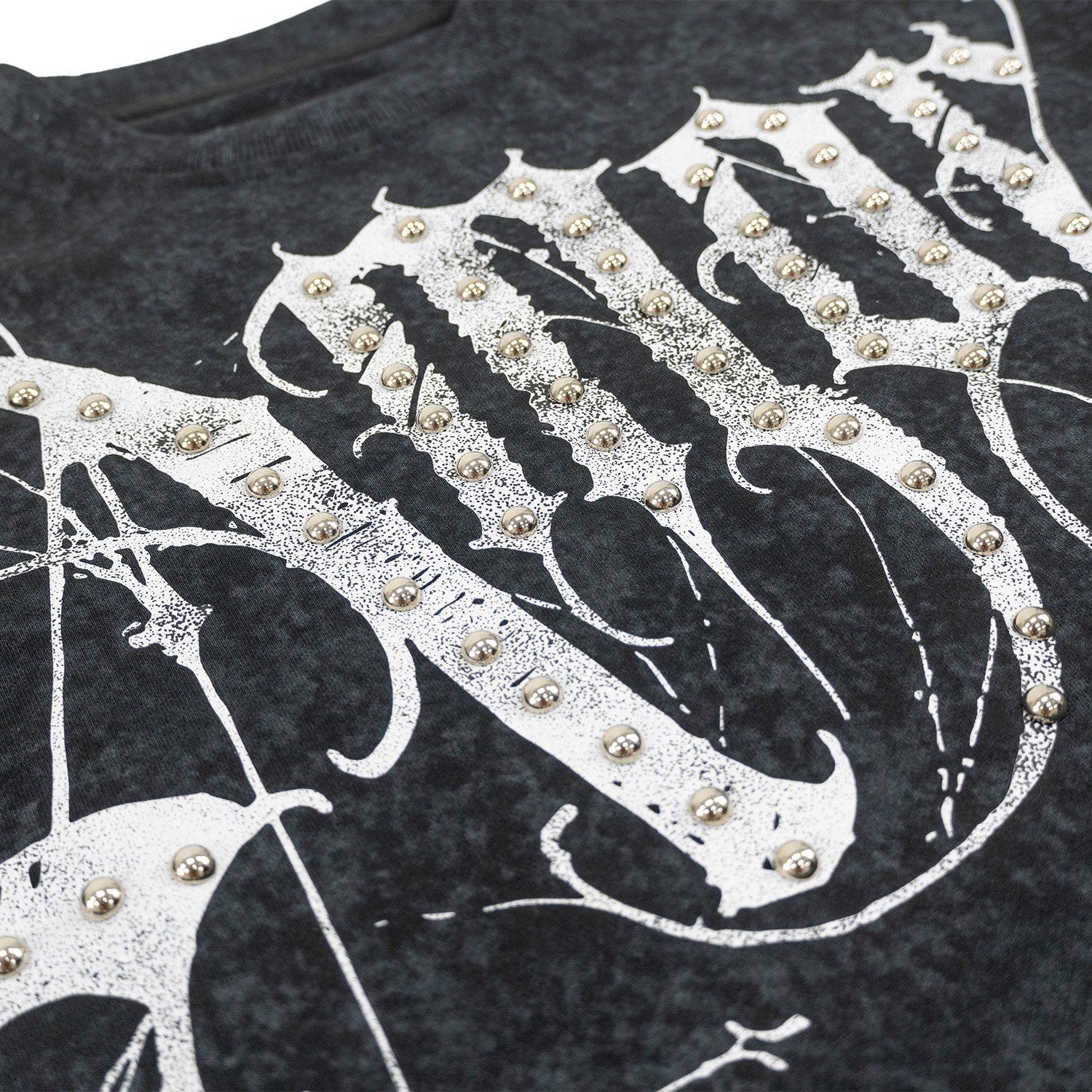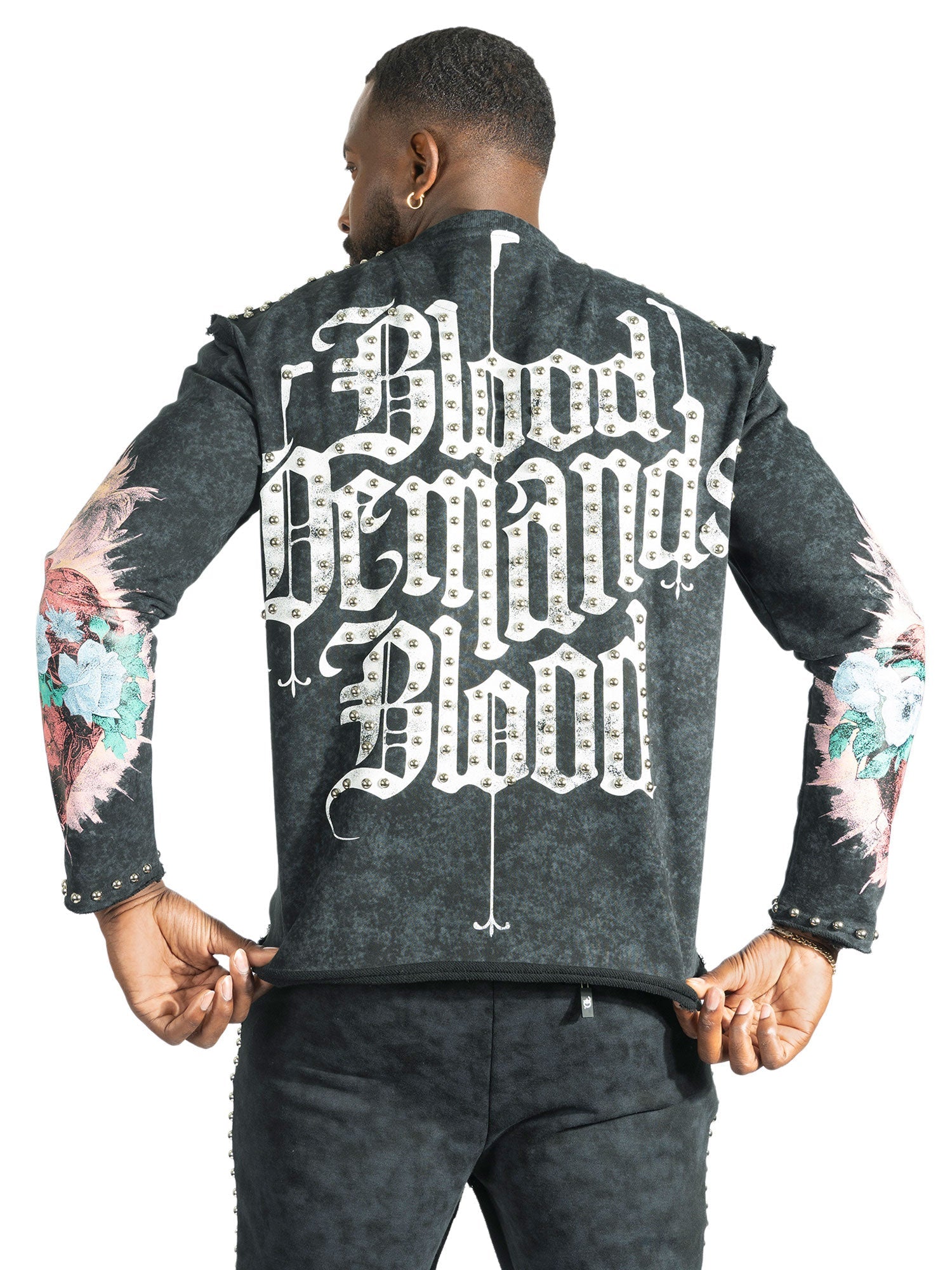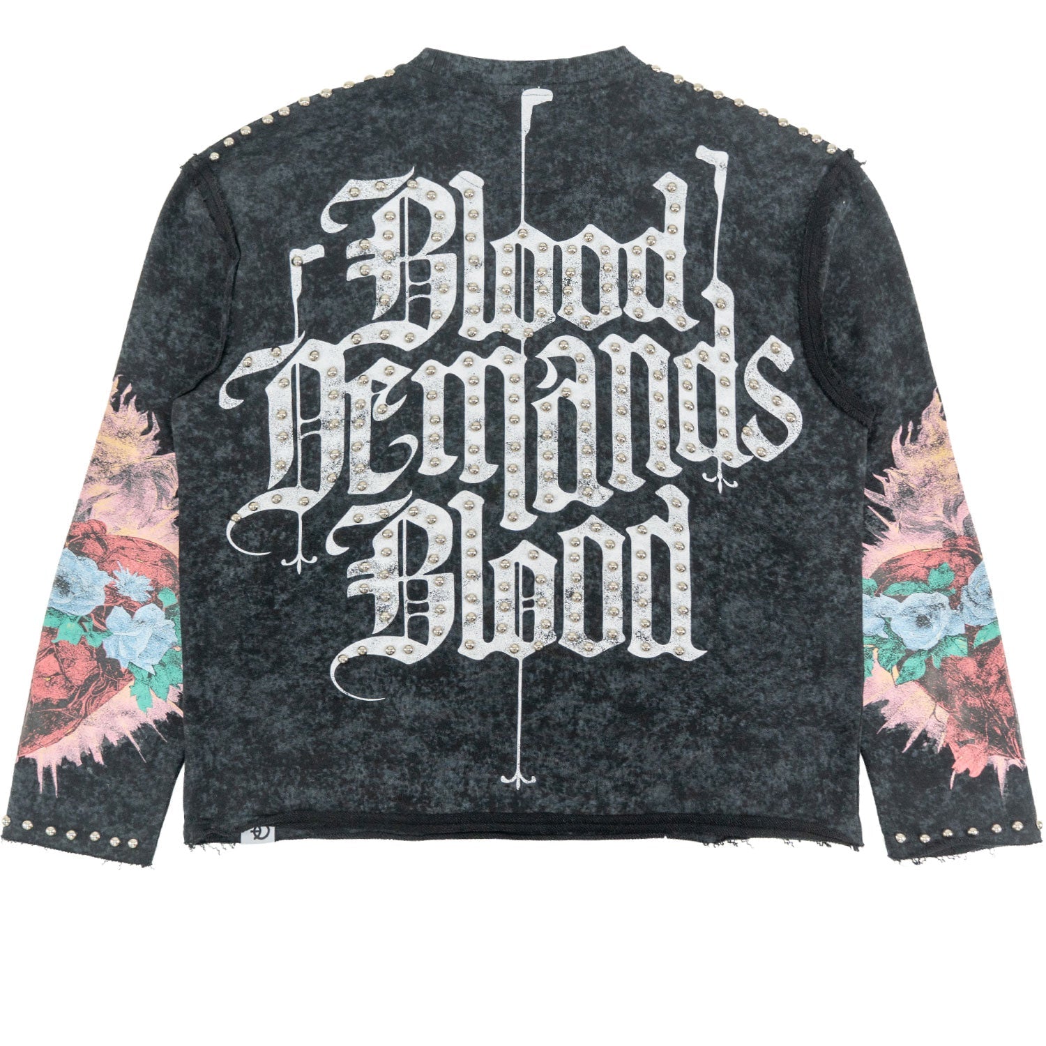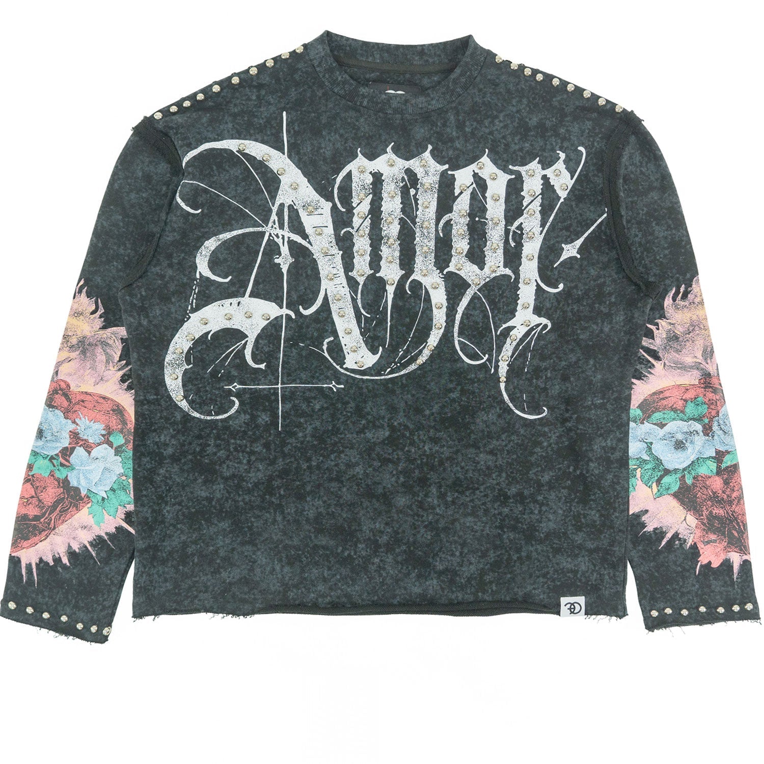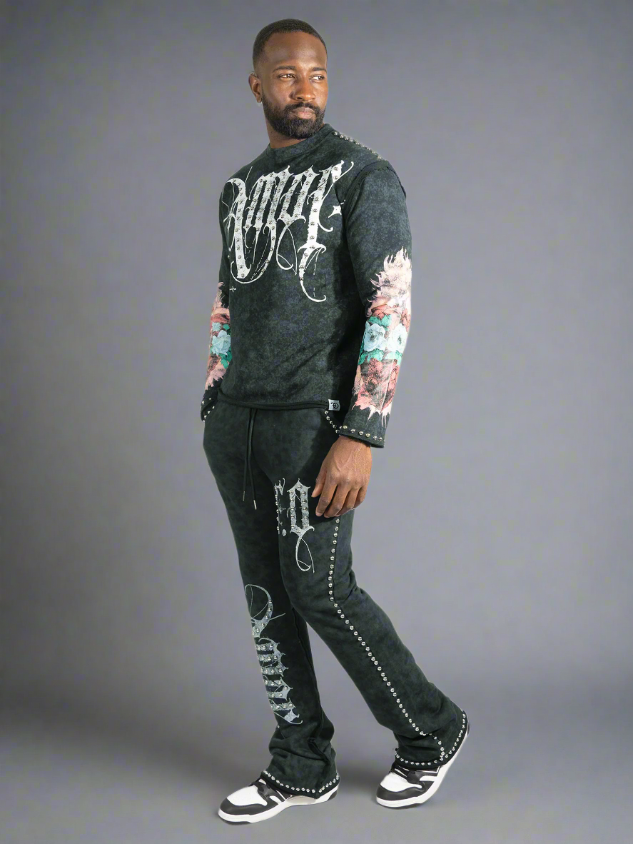 Turn heads in this standout acid-wash co-ord set that fuses vintage flair with modern street grit. The long-sleeve top features an oversized gothic-style “Amor” print across the chest, flanked by bold, high-contrast sacred heart and floral motifs on the sleeves that inject a burst of vibrant red, blue, and green into the muted palette. The back doesn't hold back either, with a heavy-hitting "Blood Demands Blood" statement in ornate blackletter script — pure attitude. Adding edge and luxury, pearl-like studs line the shoulder seams, sleeve cuffs, waistband, and pant legs, offering a glam-rock twist to this rebellious look. The matching joggers keep the energy going with distressed-style typography reading "F.O" on the thigh and a mirrored gothic design running vertically down one leg. Built for comfort with a drawstring waistband, but styled to steal the spotlight.