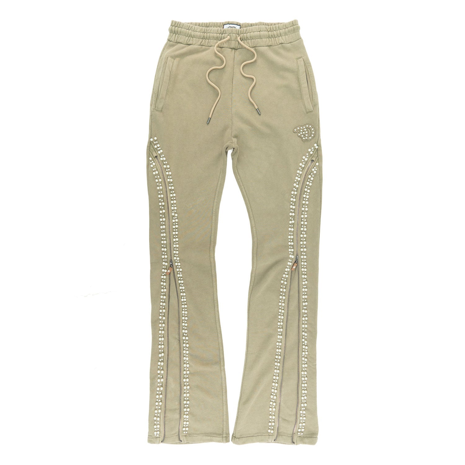 The matching stacked pants follow the theme with heavy rhinestone striping along the legs and a matching “D” logo on the front. The flared stacked fit elongates the silhouette, bringing modern urban style to life.