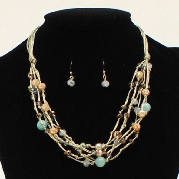 This statement set includes a multi-stranded necklace adorned with beads and accompanying earrings.