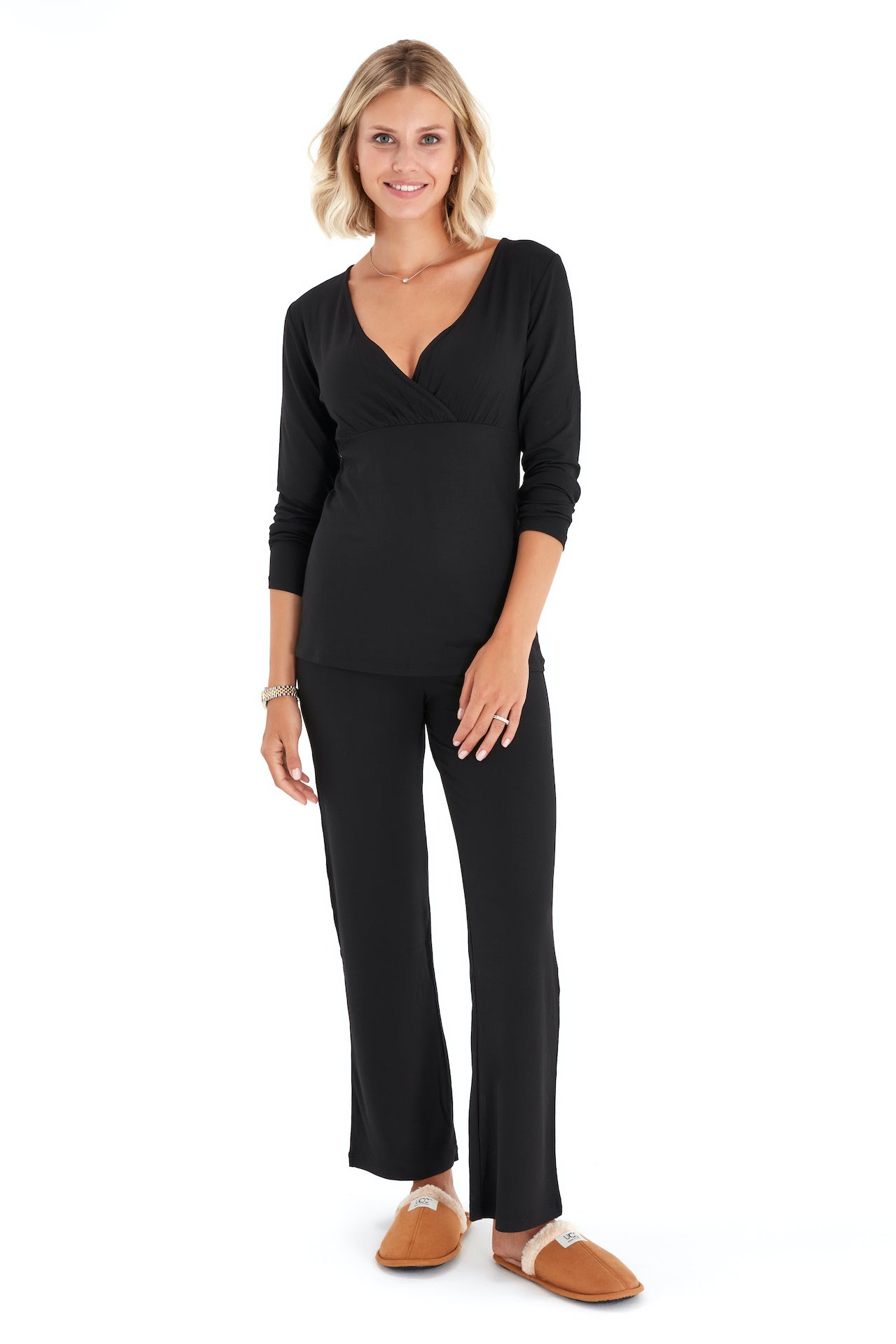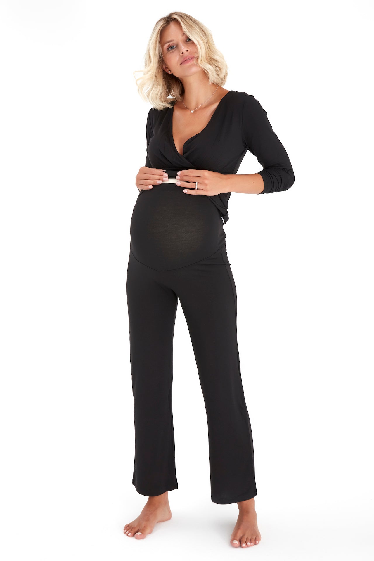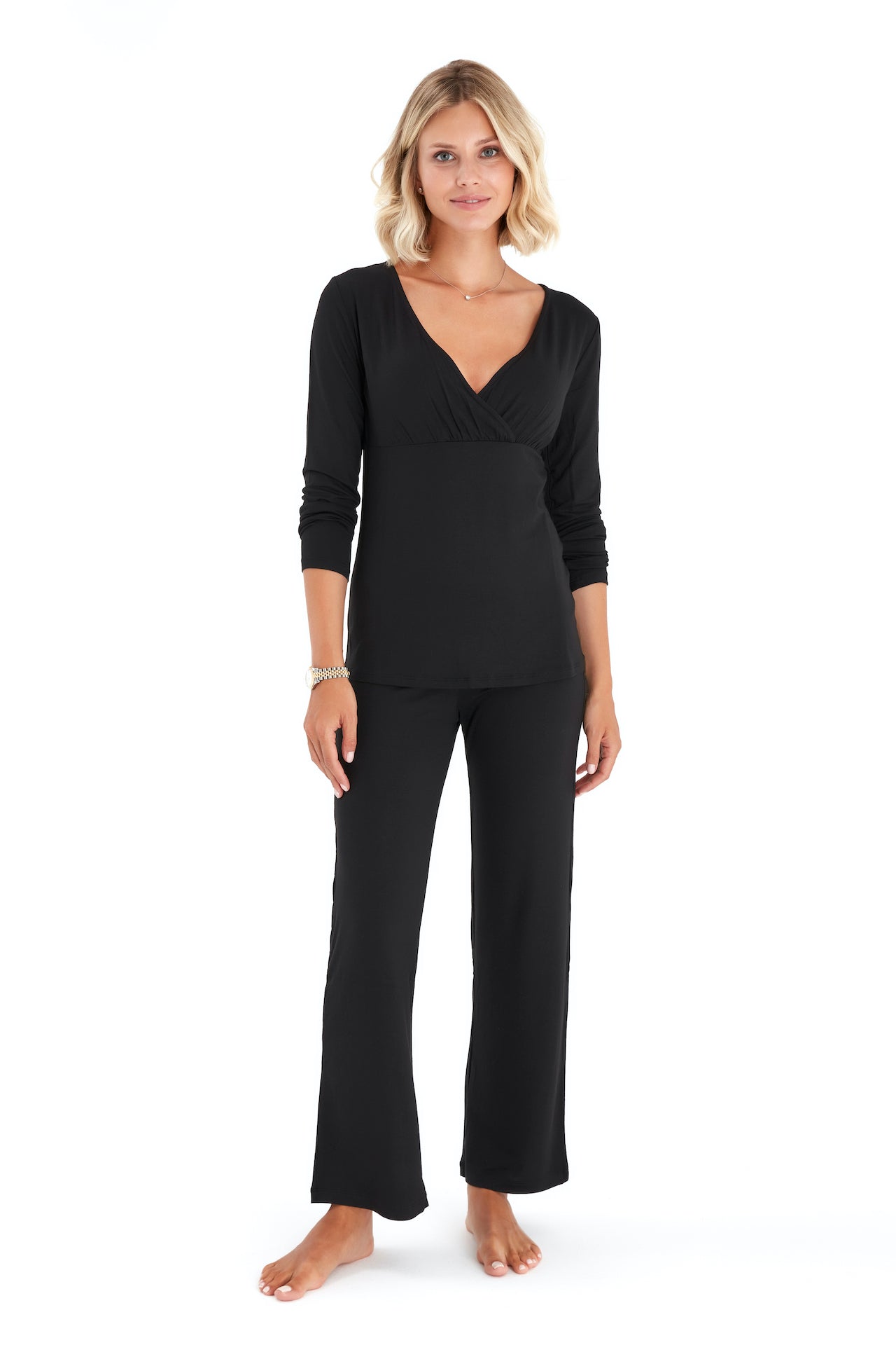 Stay comfy throughout the trimesters and beyond in these soft and stretchy pajamas featuring a nursing-friendly neckline on the top.