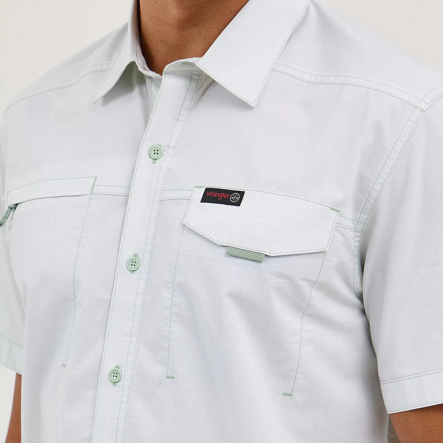 Men's Wrangler ATG slit green short sleeve with buttons. Fabric Description: 56% Polyester / 44% Repreve Recycled Polyester
