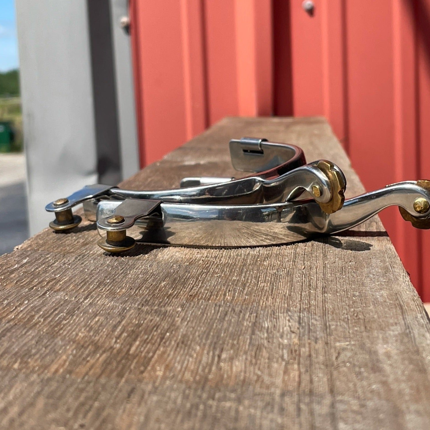 Stainless Steel All Around Spur, 1 3/4" shank, 5/8" Band, 5/8" Solid Brass Rosebud Rowels and SB Buttons
