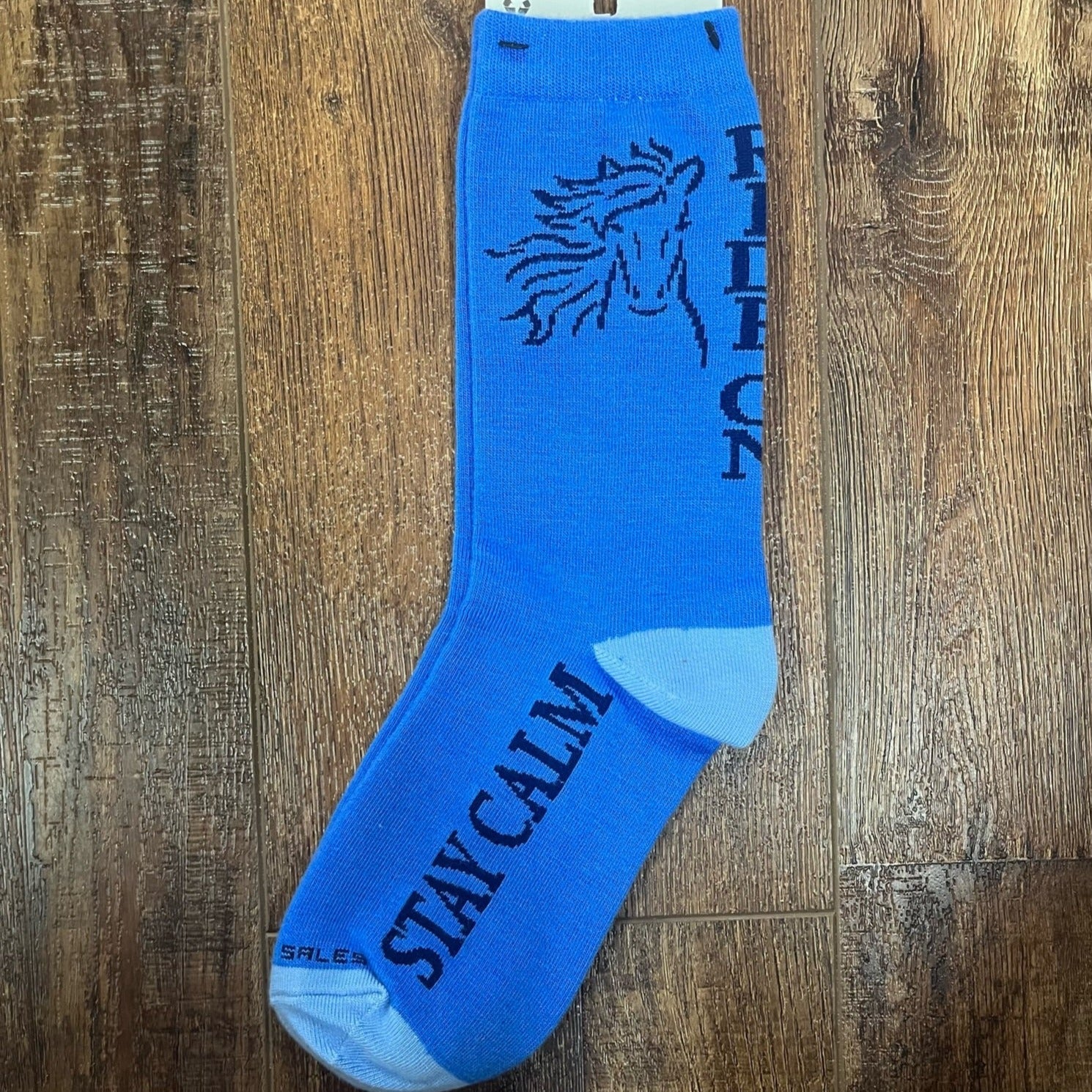 These "Stay Calm, Ride On" socks boast a navy and blue design that features a horse head.