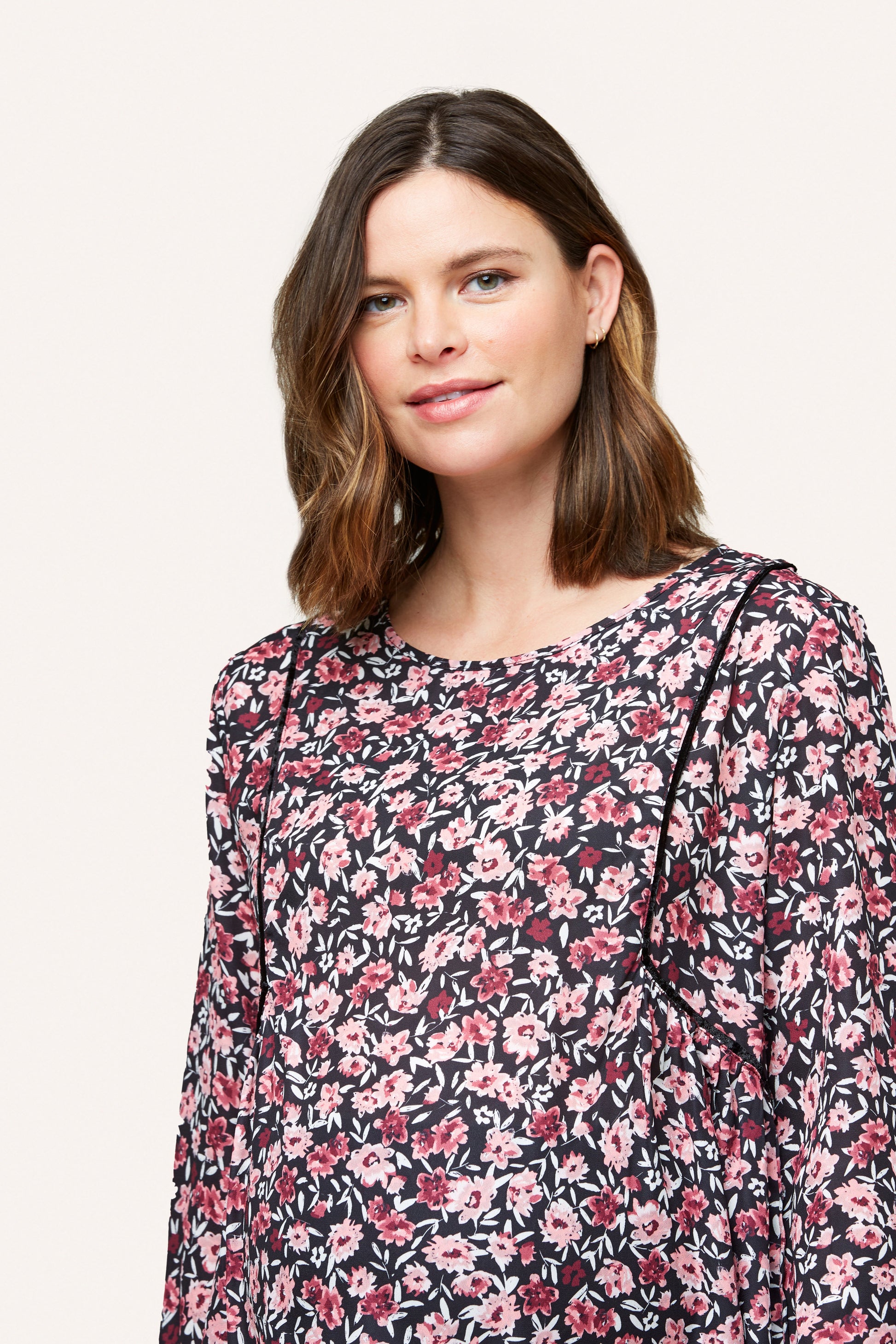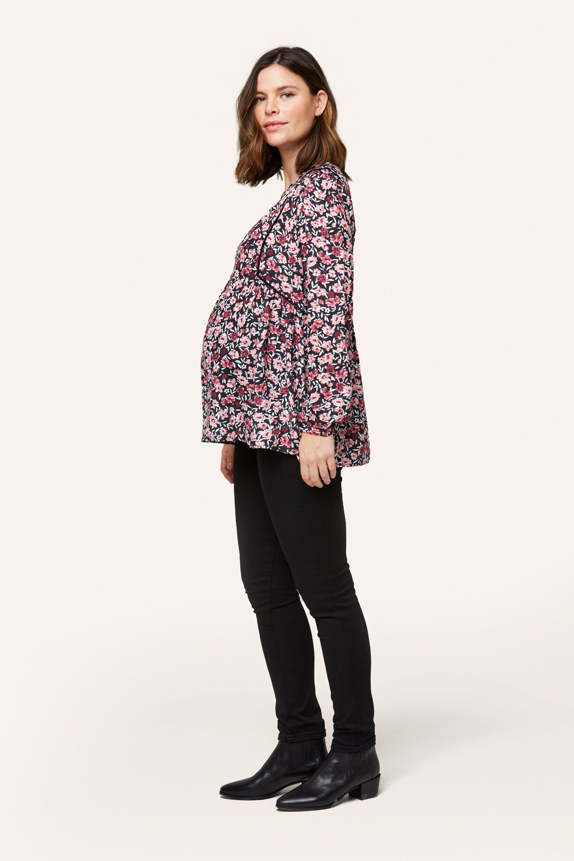 A romantic, flowy blouse that works from pregnancy to postpartum. Available in two beautiful floral prints, this top has a timeless A-line fit and contrast velvet piping that adds a little romance to your everyday look.