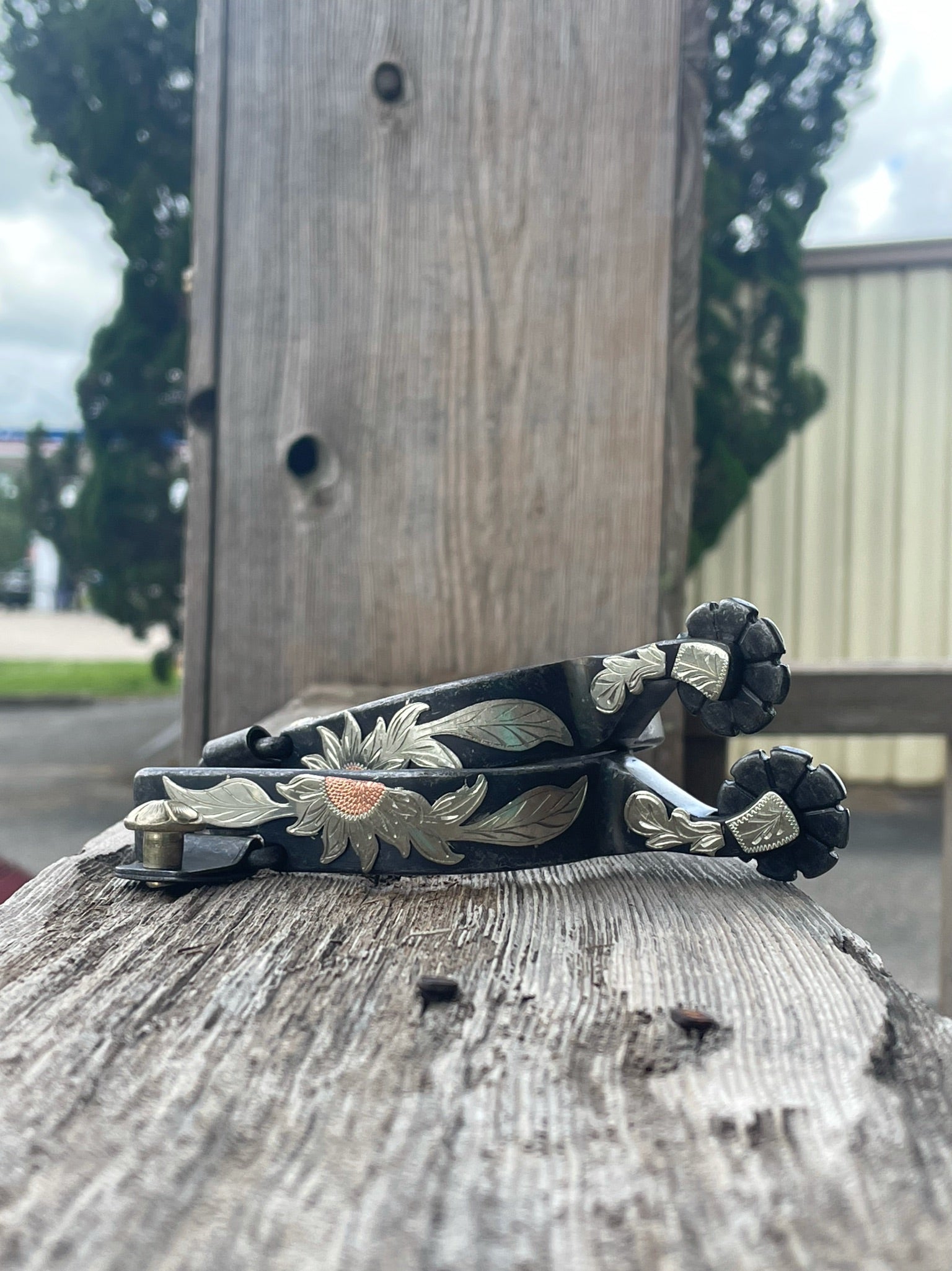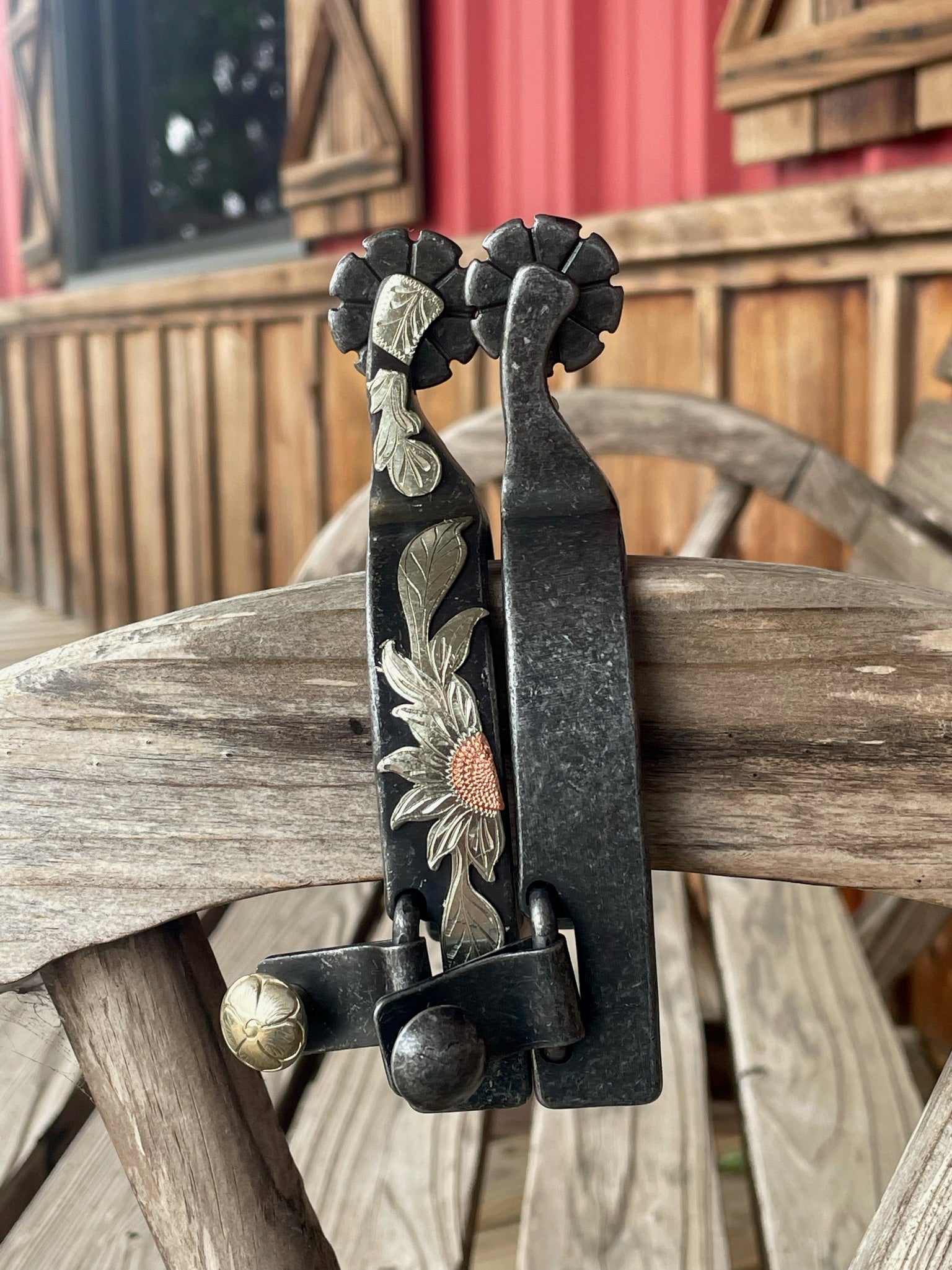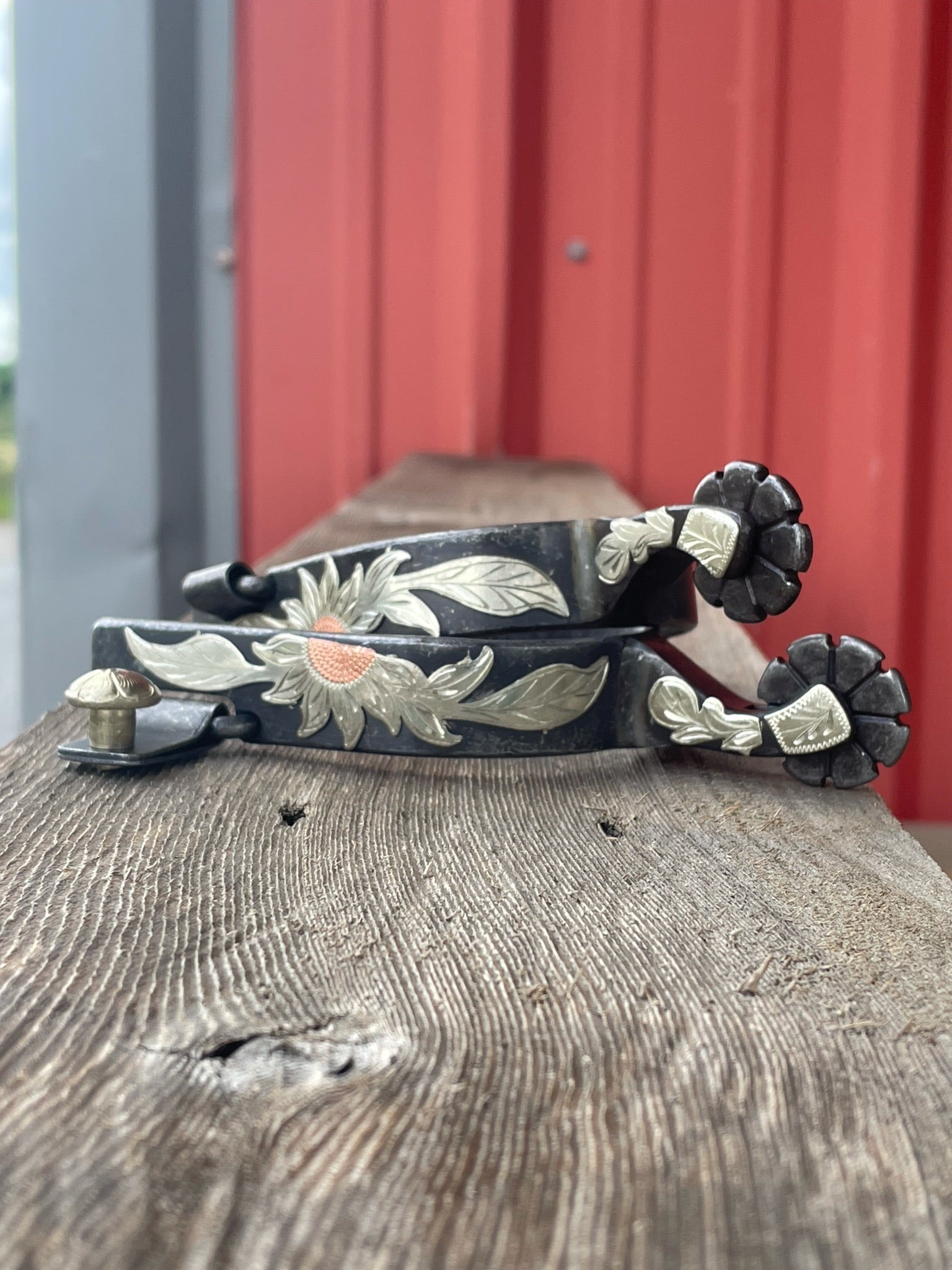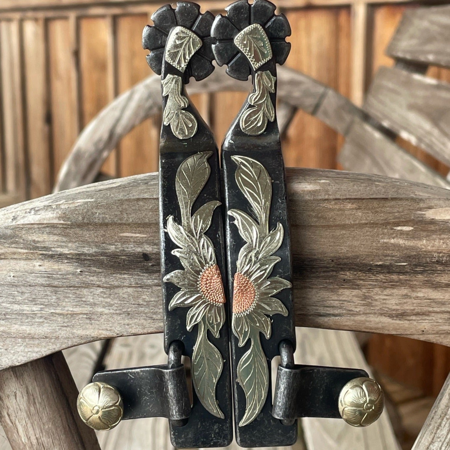 The Professional Choice Sunflower Spur has a 3/4" band and 8-point blunt rowel, this spur has a sunflower design.