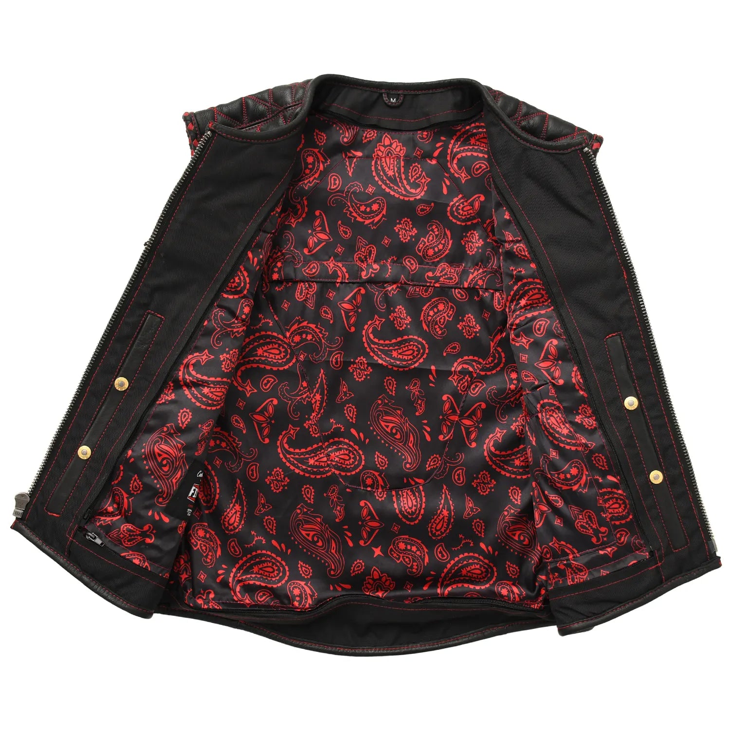 The diamond-stitched shoulders, hand-braided trim, and reinforced seams elevate the overall look. Inside, the satin green paisley liner gives the vest a custom builder vibe. This piece is designed for riders who want comfort, durability, and signature style.