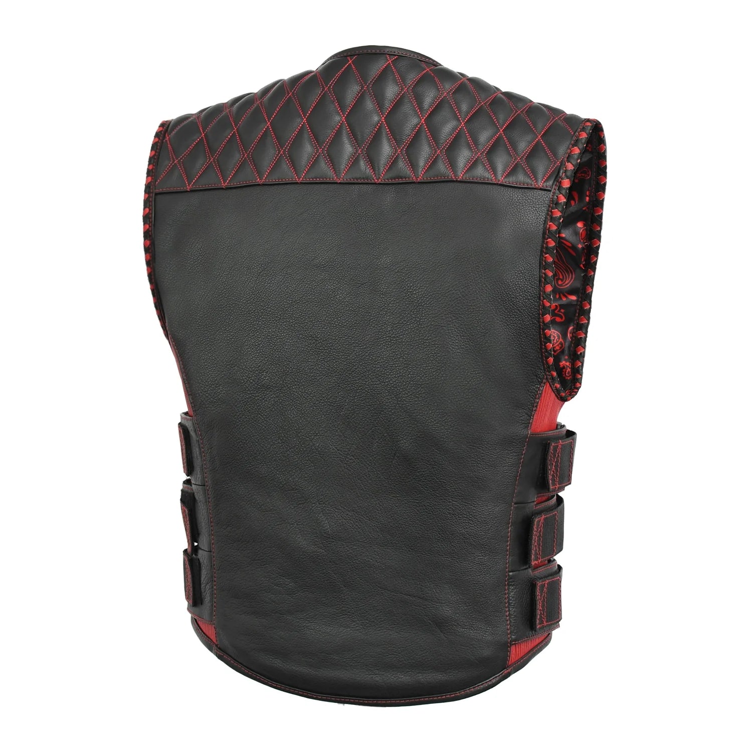 Tactical Emerald is a standout custom style vest built for riders who want performance with a bold visual edge. This vest blends premium black leather with deep emerald accents, quilt stitching, stretch rib panels, and a striking paisley liner. It offers a highly adjustable fit, strong side straps, and plenty of storage options, making it ideal for long rides, club events, or everyday street use.