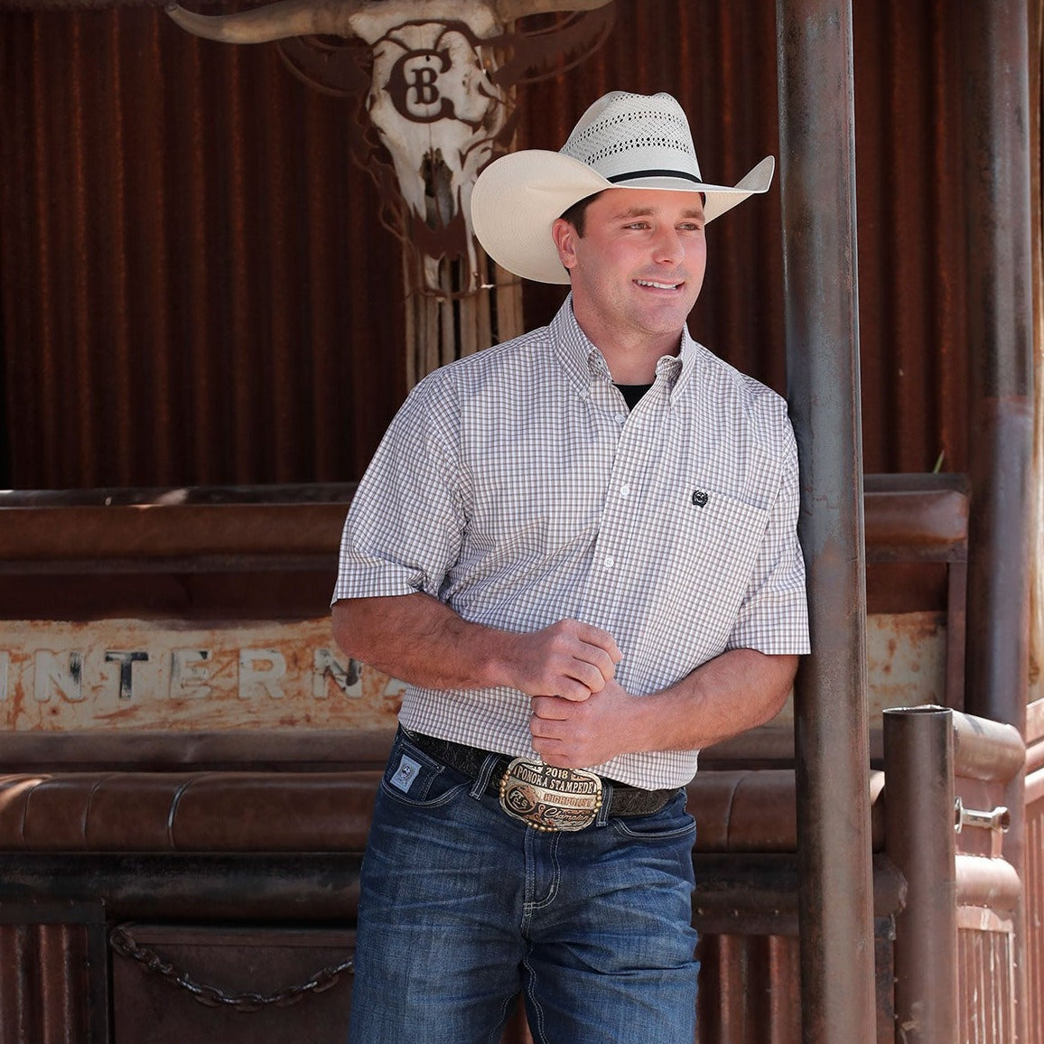 Mens Cinch short sleeve button down with a tan, red, and white plaid pattern with one chest pocket.