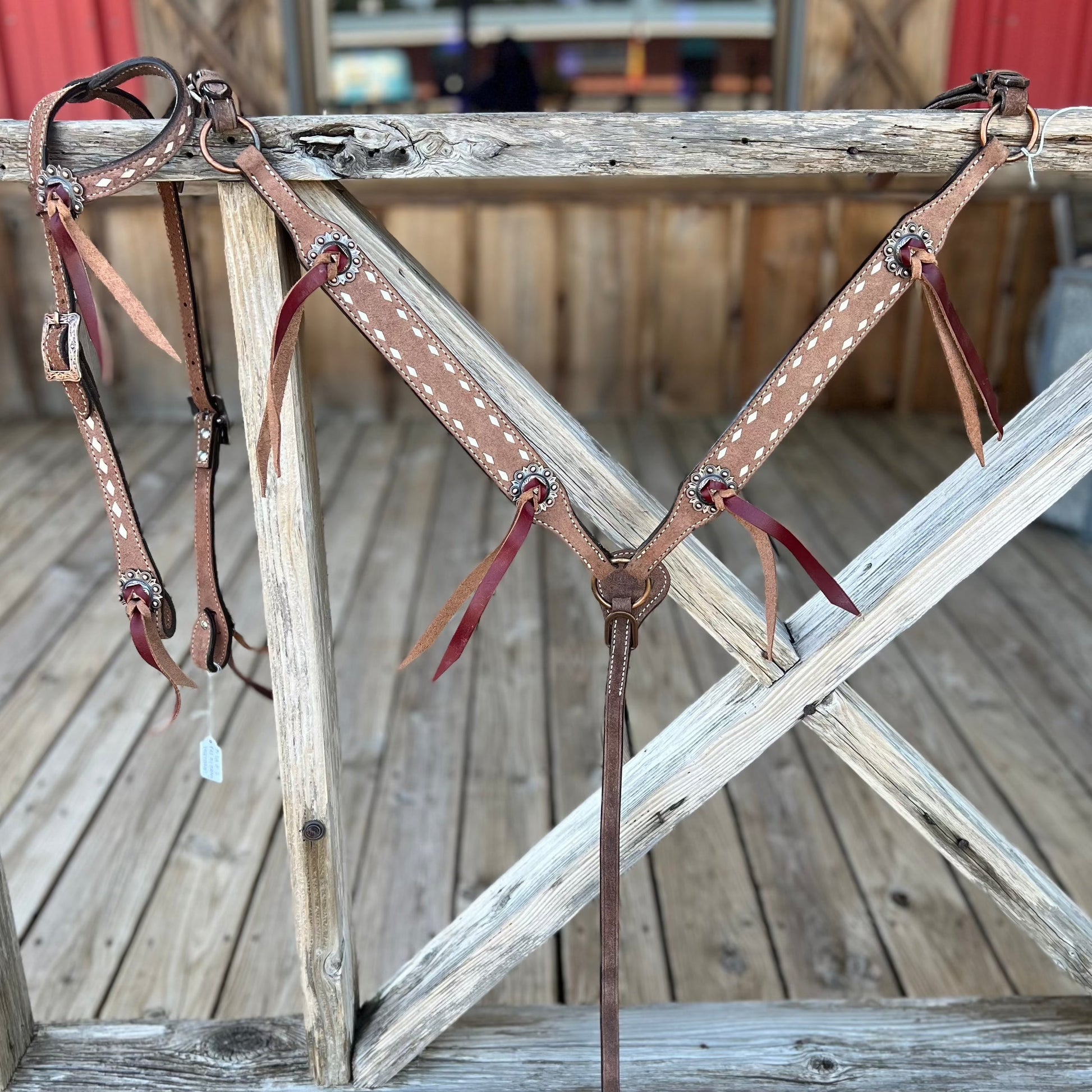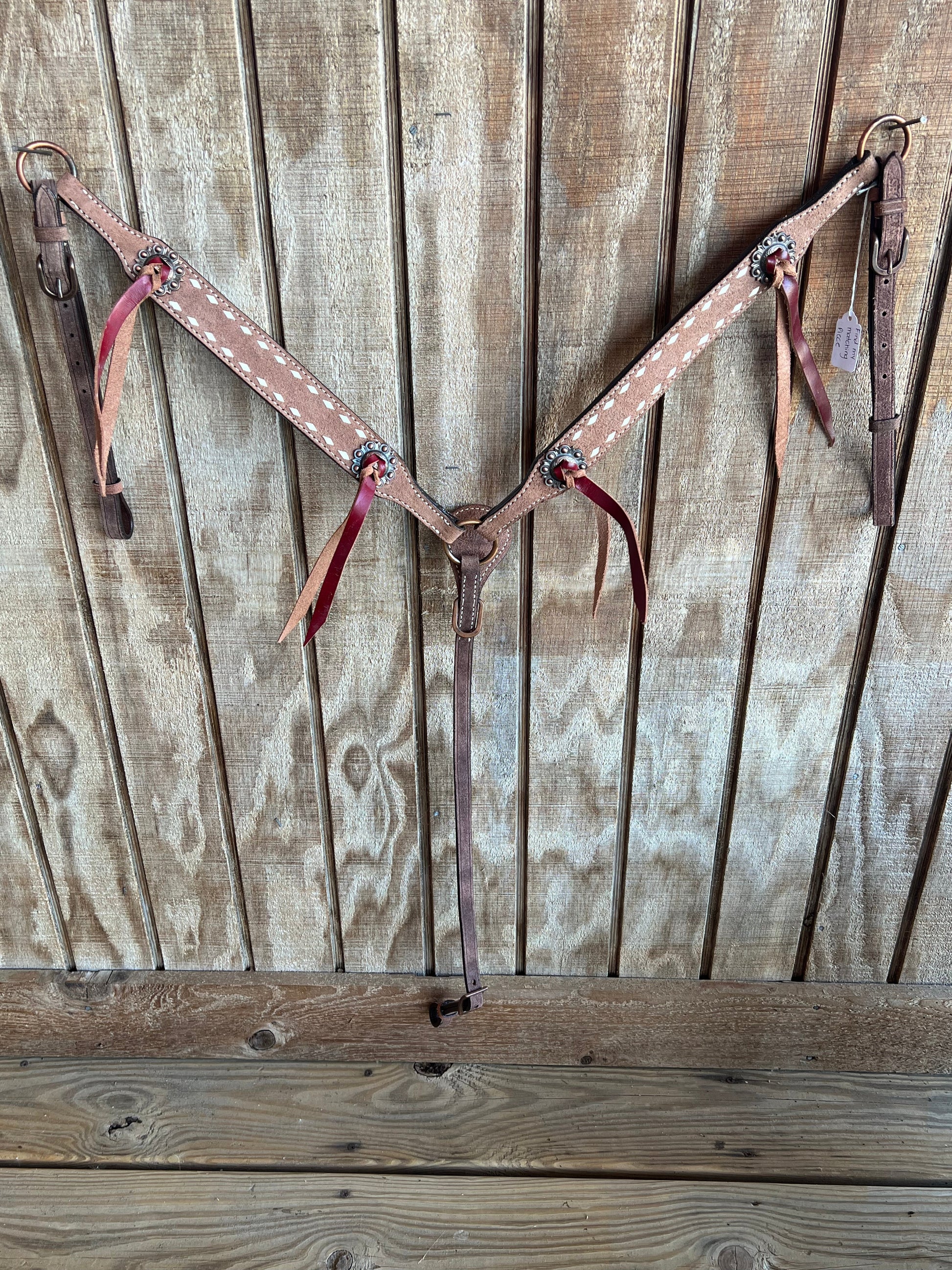 Cream buckstitch on roughout leather with tassels and copper buckles and conchos