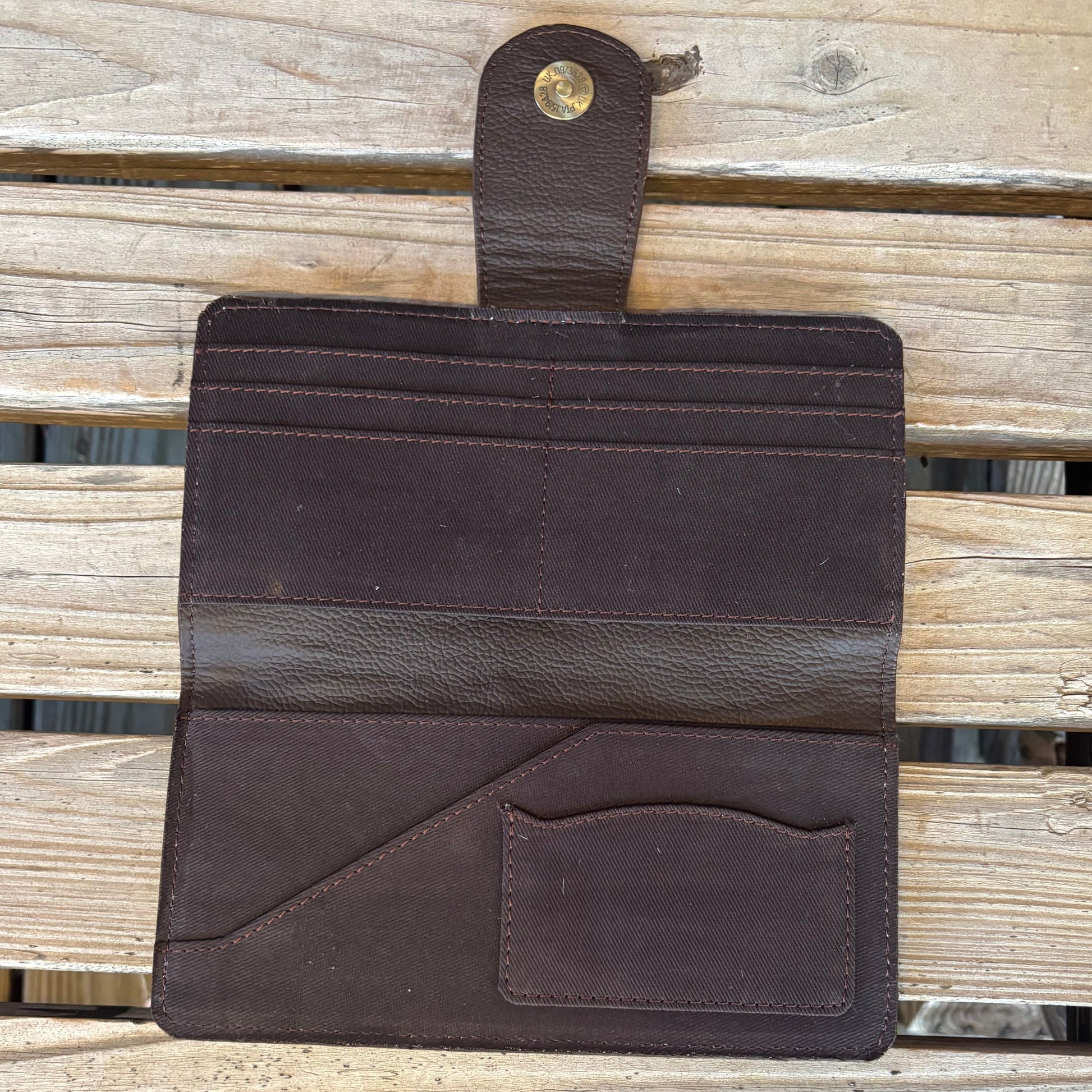 Cowhide and gator printed wallet Hair-on cowhide design, Teal and brown gator leather overlay, Magnetic buckle closure, Includes inner card holder slots for organized storage of cards and small essentials, Measures: 8 in. x 4.5 in.