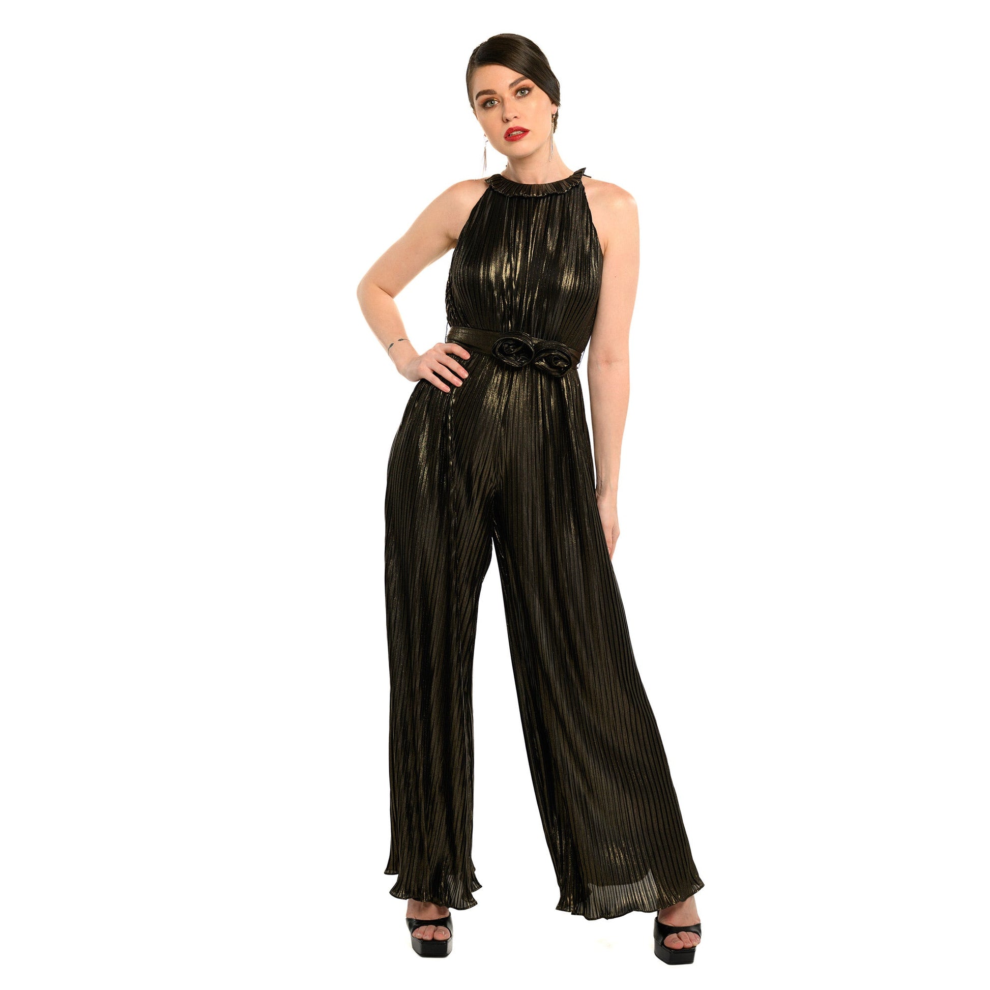 Exude elegance and elevate your appearance with The Bardot's Unique Halter Palazzo Jumpsuit. Meticulously tailored from opulent Pleated Luxered Novelty Fabric in a striking combination of gold and black, this jumpsuit is guaranteed to make a statement. The sophisticated halter neckline and eye-catching rose belt accentuate your figure, while the palazzo style offers unparalleled comfort and freedom of movement. From formal occasions to evenings out, the full length design exudes timeless class and refinement. Make a lasting impression and command attention with this dazzling piece.