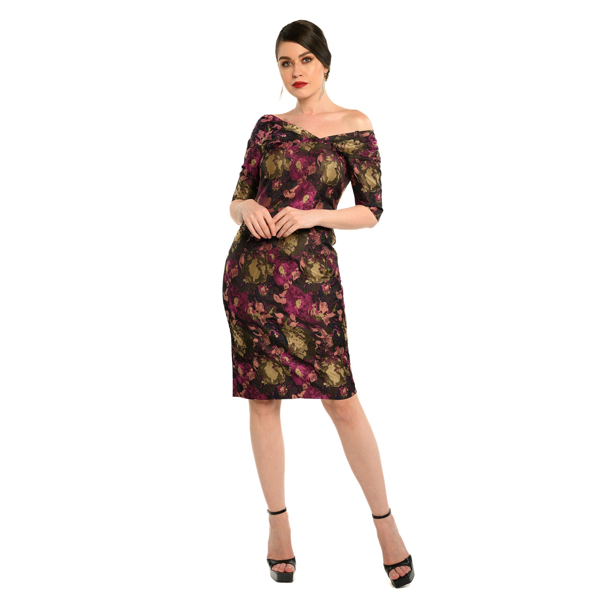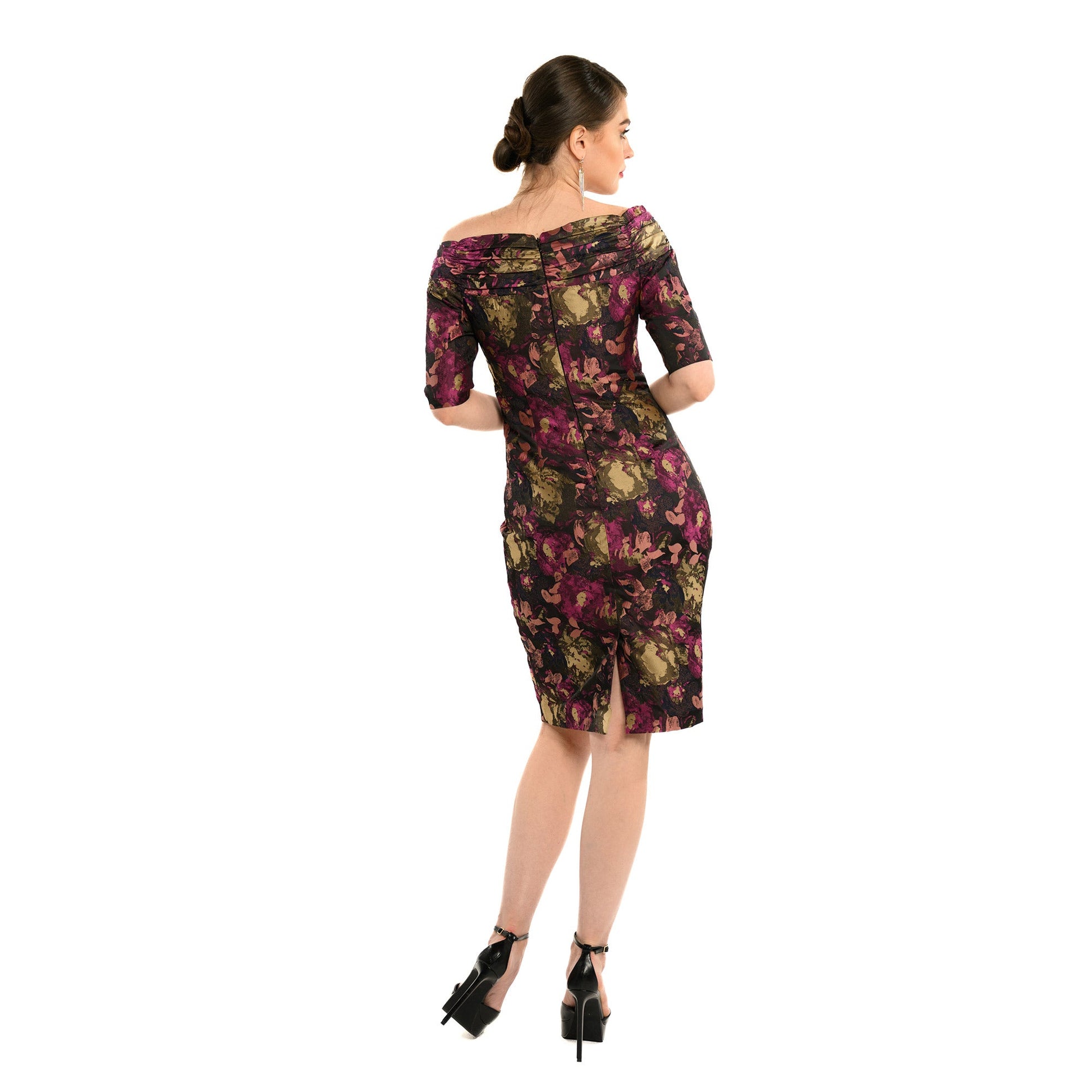 The Dandridge features extraordinary Novelty Brocade Fabric in a beautiful contrast of purple, green, brown, and yellowish shades. The off-shoulder sheath dress is an elegant choice for autumnal events with its sophisticated knee length and elbow sleeves, giving it a graceful, feminine flair. Its darker hues and delicate trims create a look that is both classic and refined. This dress is sure to be a timeless staple in any wardrobe!