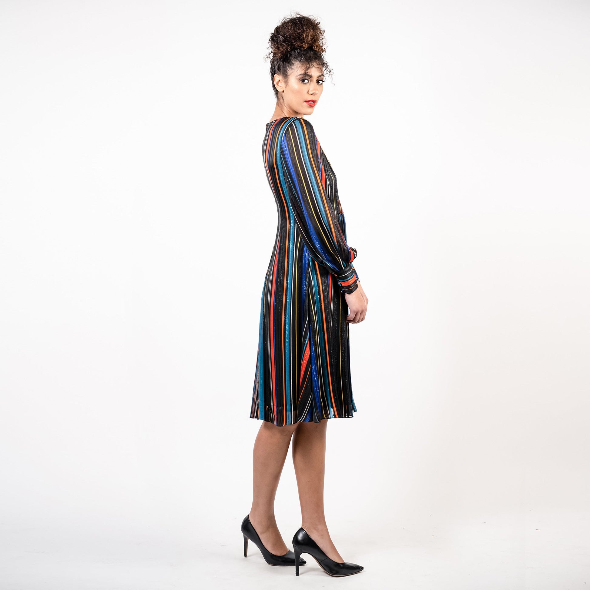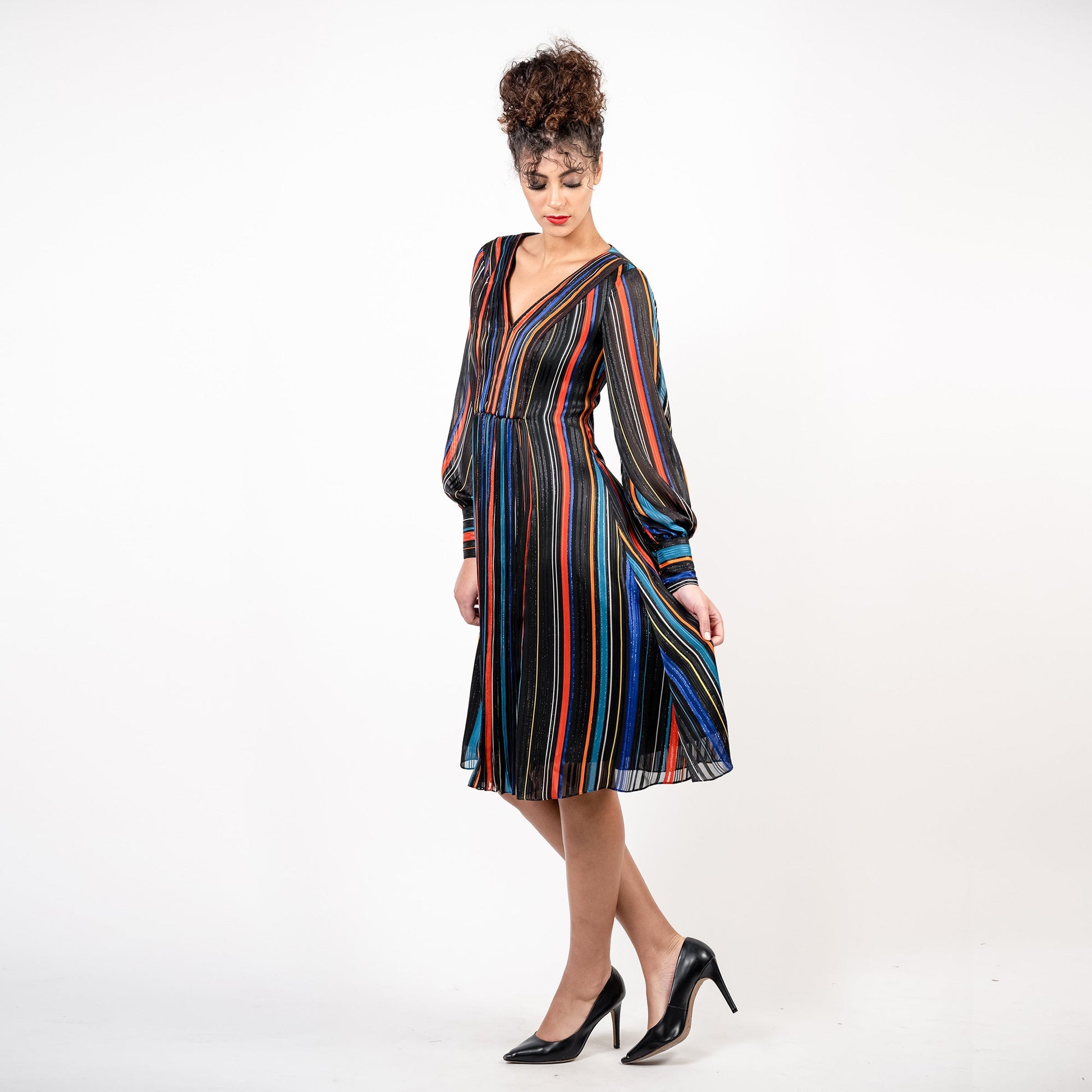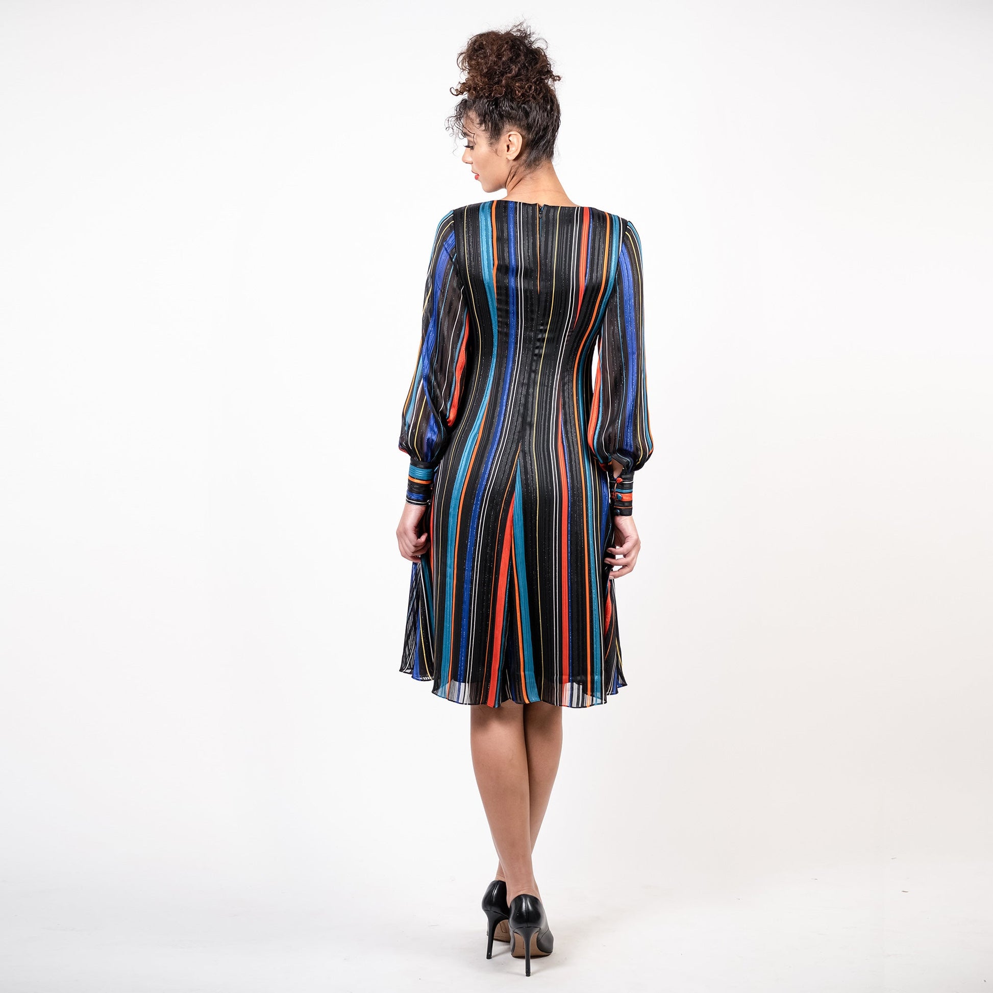 Intricate cartridge pleating running through the center of a breezy flared skirt combined make this gorgeous dress a Masterpiece. Made from stunning lurexed striped chiffon, this dress is a timeless must have.