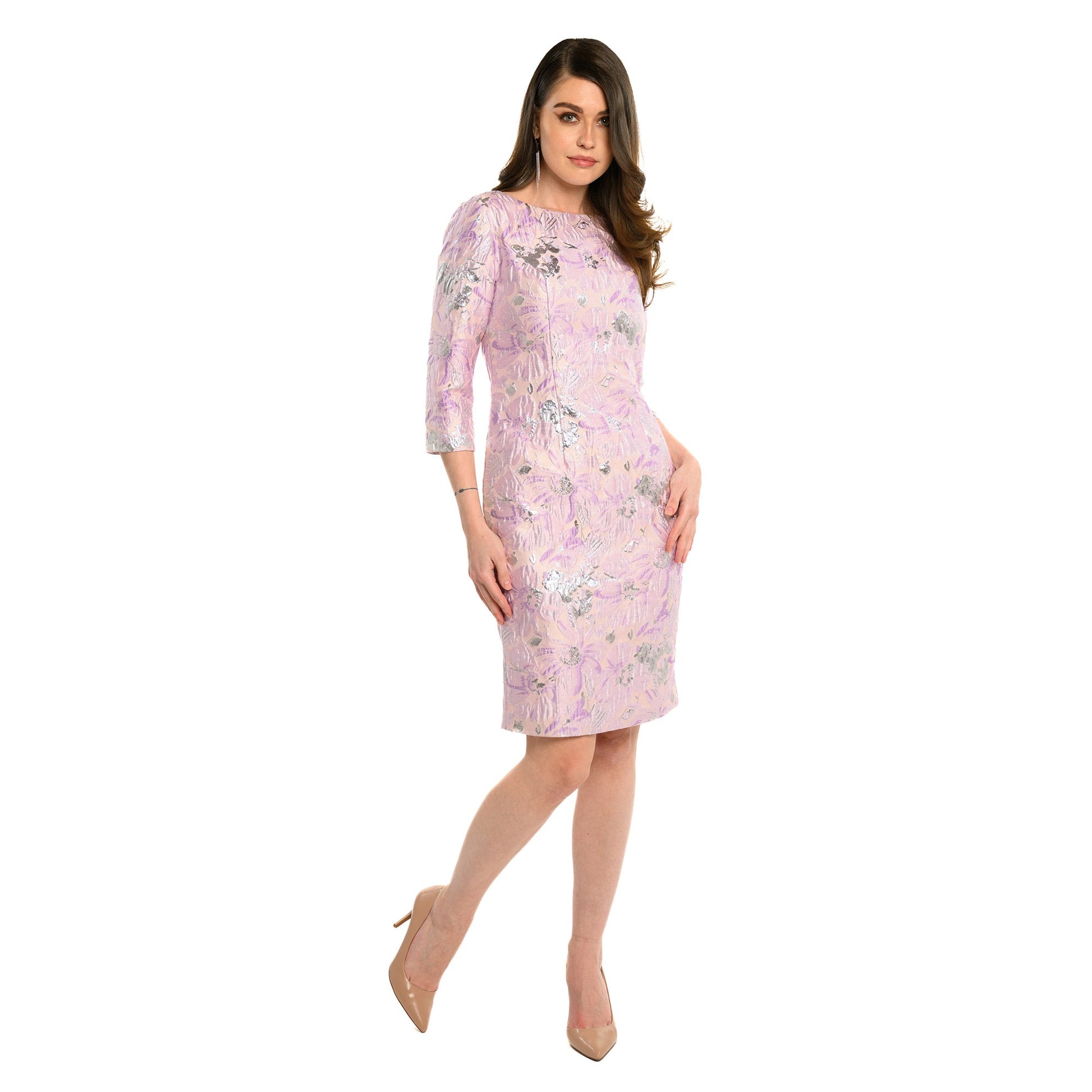 Choose The Isabella. This elegant, understated garment comes in spectacular shades of Pink with Gold, Lavender and Silver, or Green and Blue. With so many tones available, you can craft it into any look. And when you don the Novelty Jacquard Fabric, you'll sense the serenity and comfort. Its intricate pattern with 3/4 sleeves and snug fit gives it the perfect royal feel. Step into this dress and unleash your inner royal.