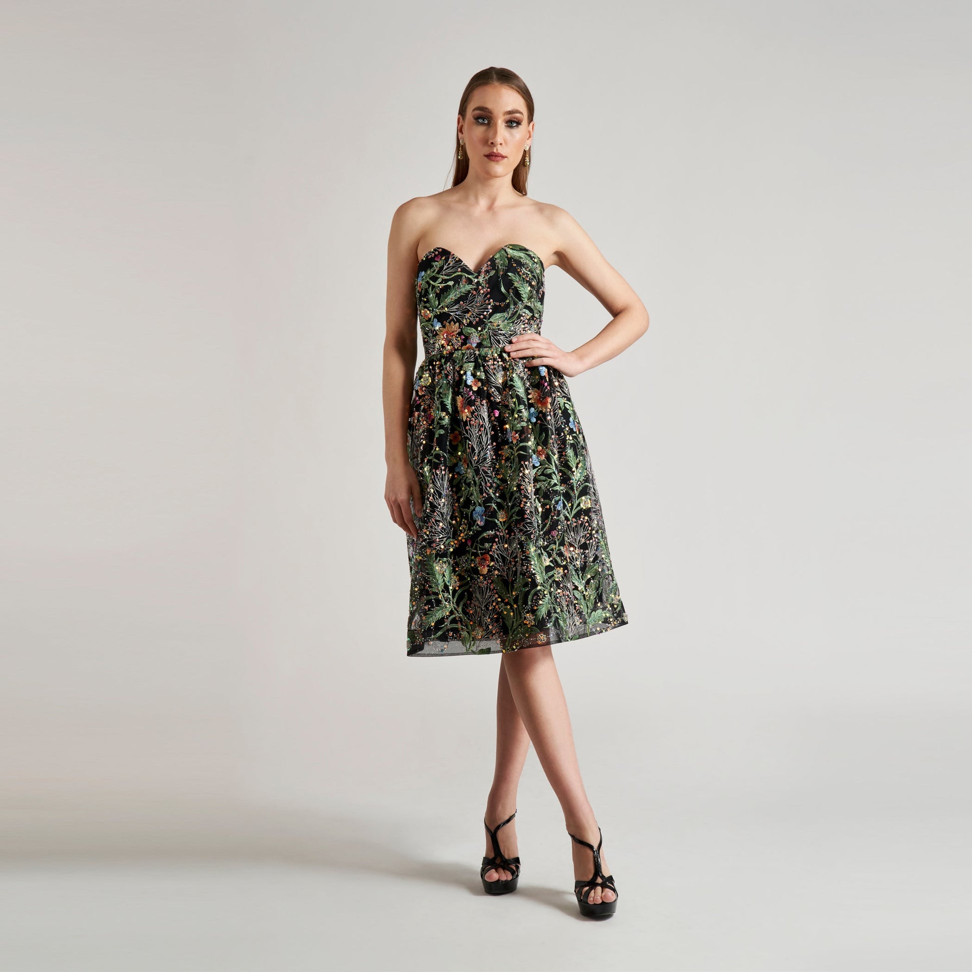 Experience ultimate elegance in The Letizia dress. The strapless bodice boasts a wired V neckline for a touch of sophistication. Made from luxurious embroidered mesh adorned with iridescent sequins and crystals, the fit & flare silhouette flatters your figure. Its built-in bustier adds structure and supports your waist.