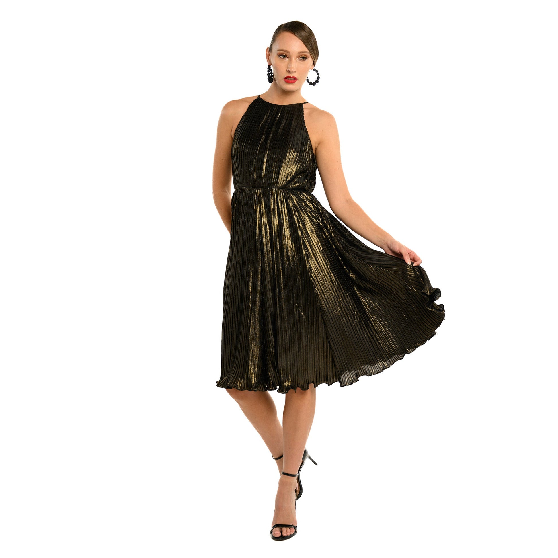 The Mansfield features a bold, elegant look with its golden and black hues and Pleated Luxered Novelty fabric. Its unique halter design is eye-catching and the midi length is comfortable and perfect for any occasion. Its subtle back adds a touch of sophistication, while the hourglass silhouette accentuates the waist. Feel young and chic with this stunning dress! Its unique design and color combination are sure to make a statement.