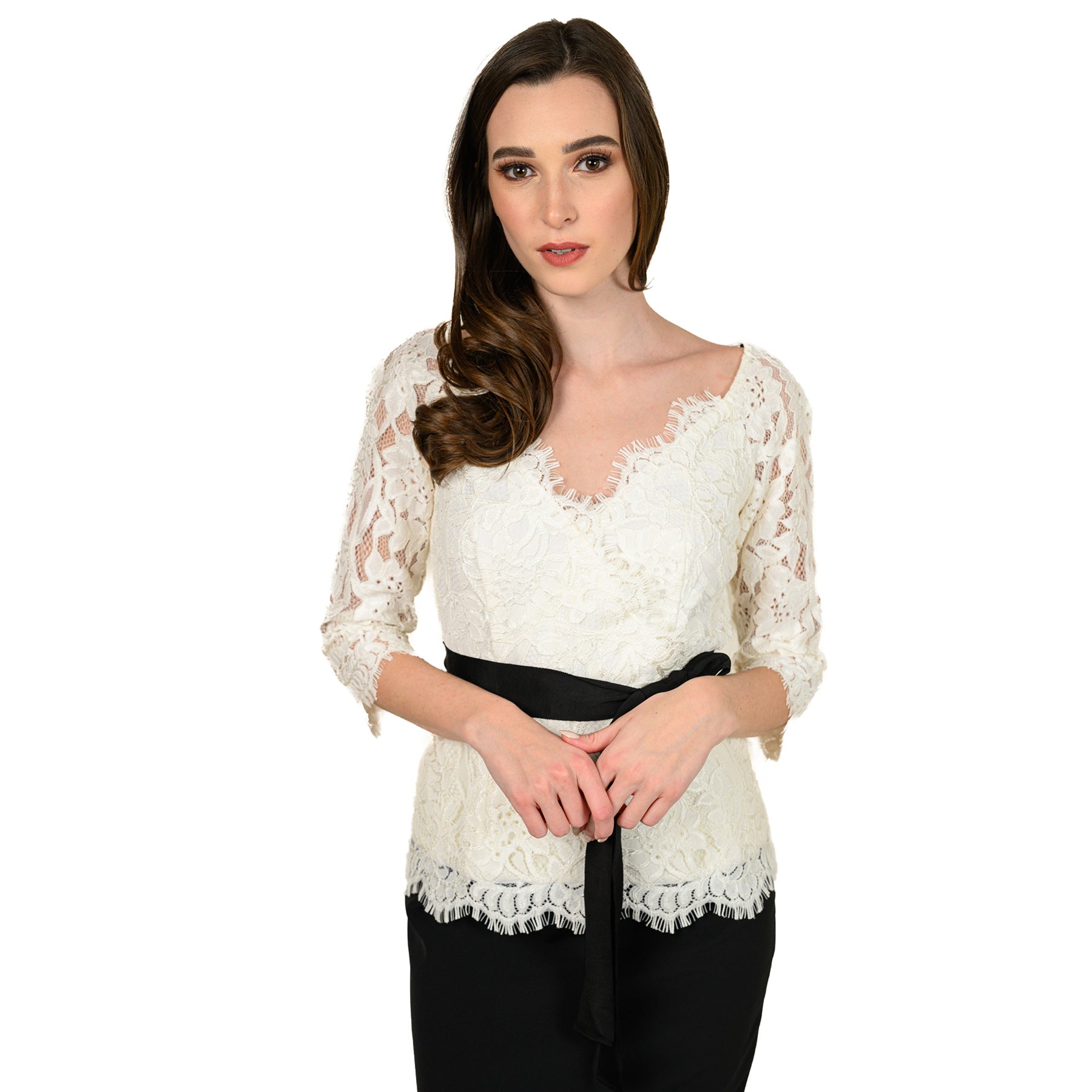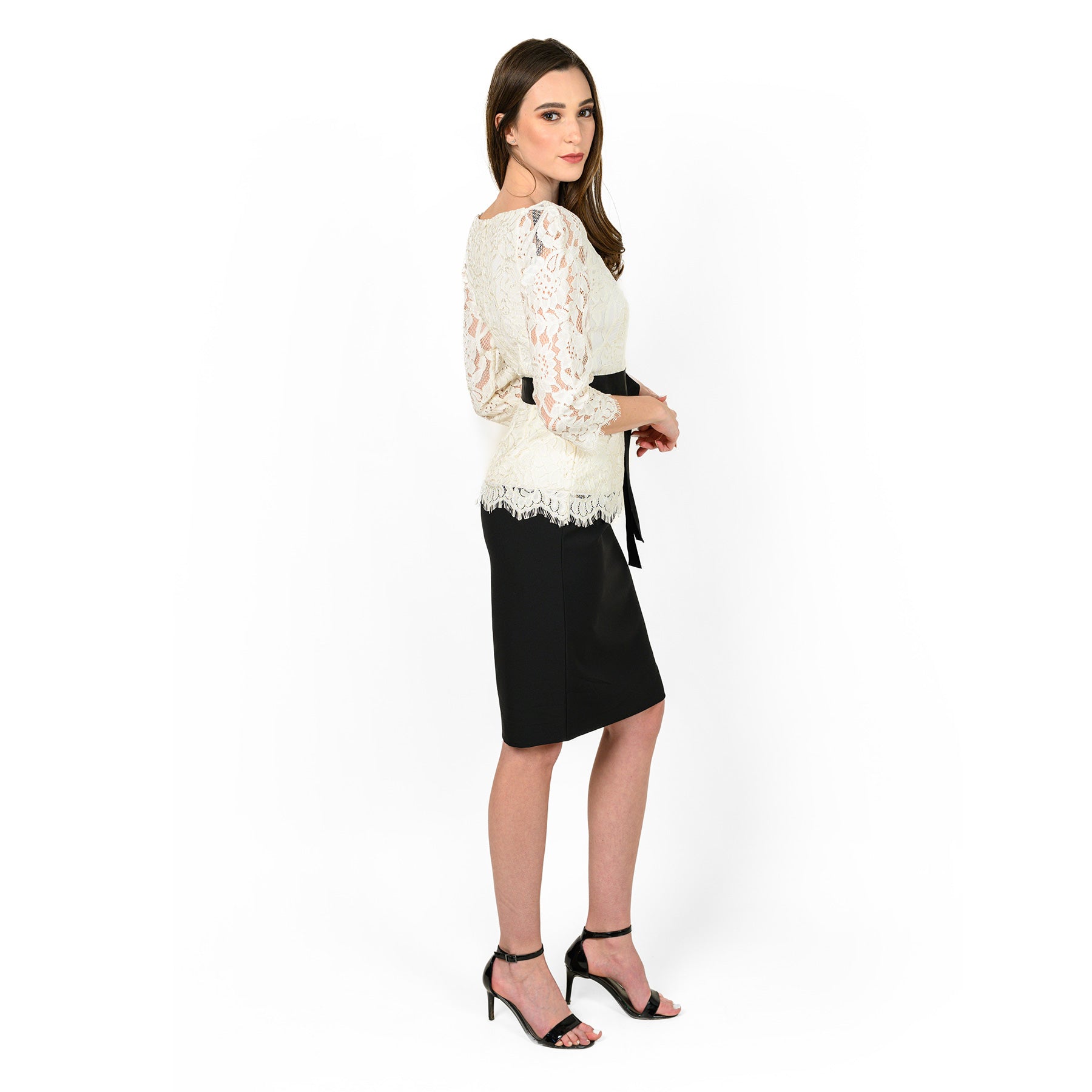 Eye-catching lace brings a modern twist to a traditional look. The skin-baring sleeves and neckline create the perfect harmony of elegance and neatness.