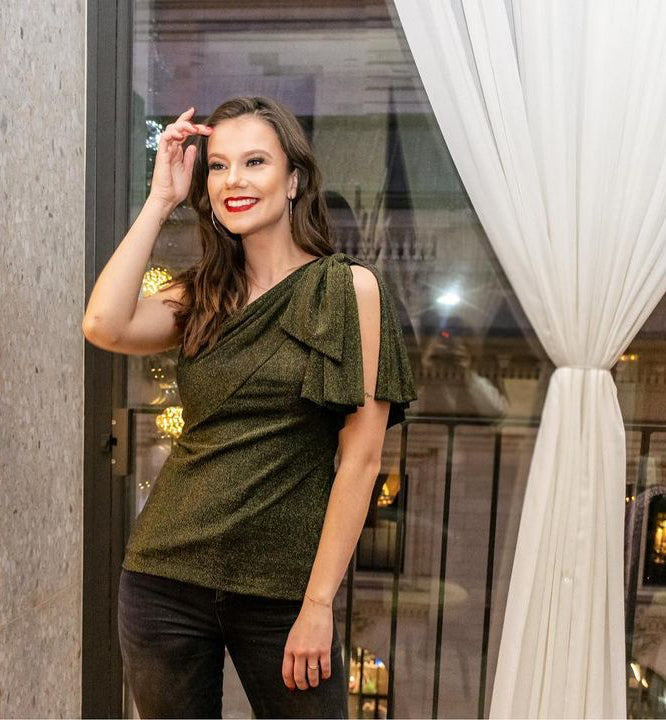 Experience the luxurious appeal of The Ritz-Carlton, a one-shoulder asymmetric bow blouse that offers an elegant statement. Its Lurex Jersey black and gold fabric is truly exquisite, giving you a look of glamour for the most special occasions. Let its bow give you a feminine flair that's sure to elevate your ensemble.