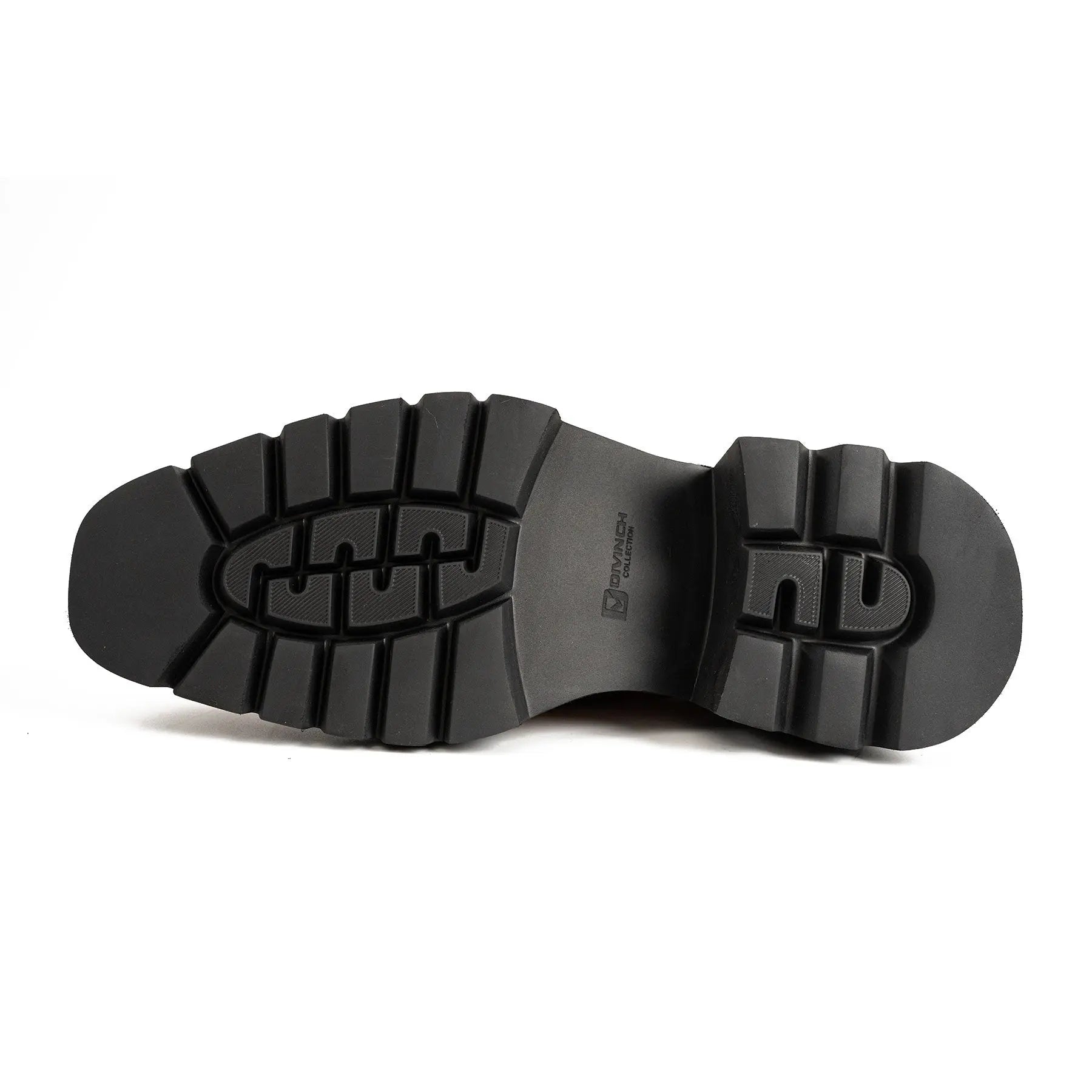 Built for both style and comfort, these derby shoes feature a chunky black rubber sole with distinctive red piping along the edges, creating a striking contrast. The zigzag tread pattern ensures reliable traction, making them as practical as they are fashionable.