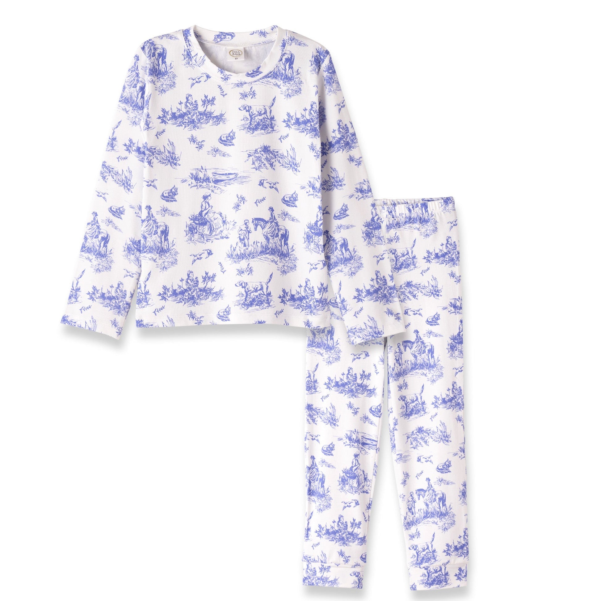 This classic Toile de Jouy girl's pajama set is made with our bamboo-cotton blend fabric for ultimate comfort. It's incredibly soft, absorbent, hypoallergenic, and environmentally friendly. It also provides excellent ventilation, heat regulation, and is resistant to sweat. 67% bamboo, 28% cotton, and 5% spandex. It's machine washable and can be tumble-dried on low. Pants have elasticized waist for easy on and off. Also available in baby and adult sizes for family matching.