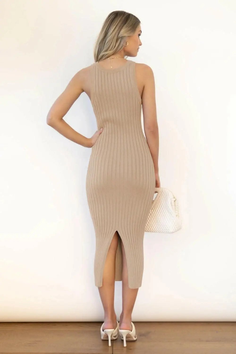 Elevate your wardrobe with a versatile ribbed sleeveless dress designed for comfortable, all-day wear. The midi silhouette features a subtle slit and a refined rib texture that enhances your figure without adding bulk.