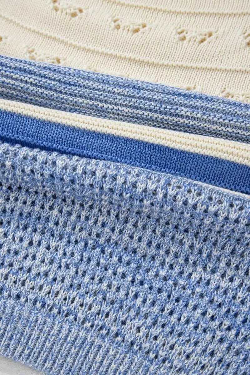 The design features a color-block knit with cream, blue, and gray tones, adding visual interest while remaining easy to coordinate with other pieces. The fabric is machine washable for convenient care; wash cold and tumble dry low to maintain shape and softness.