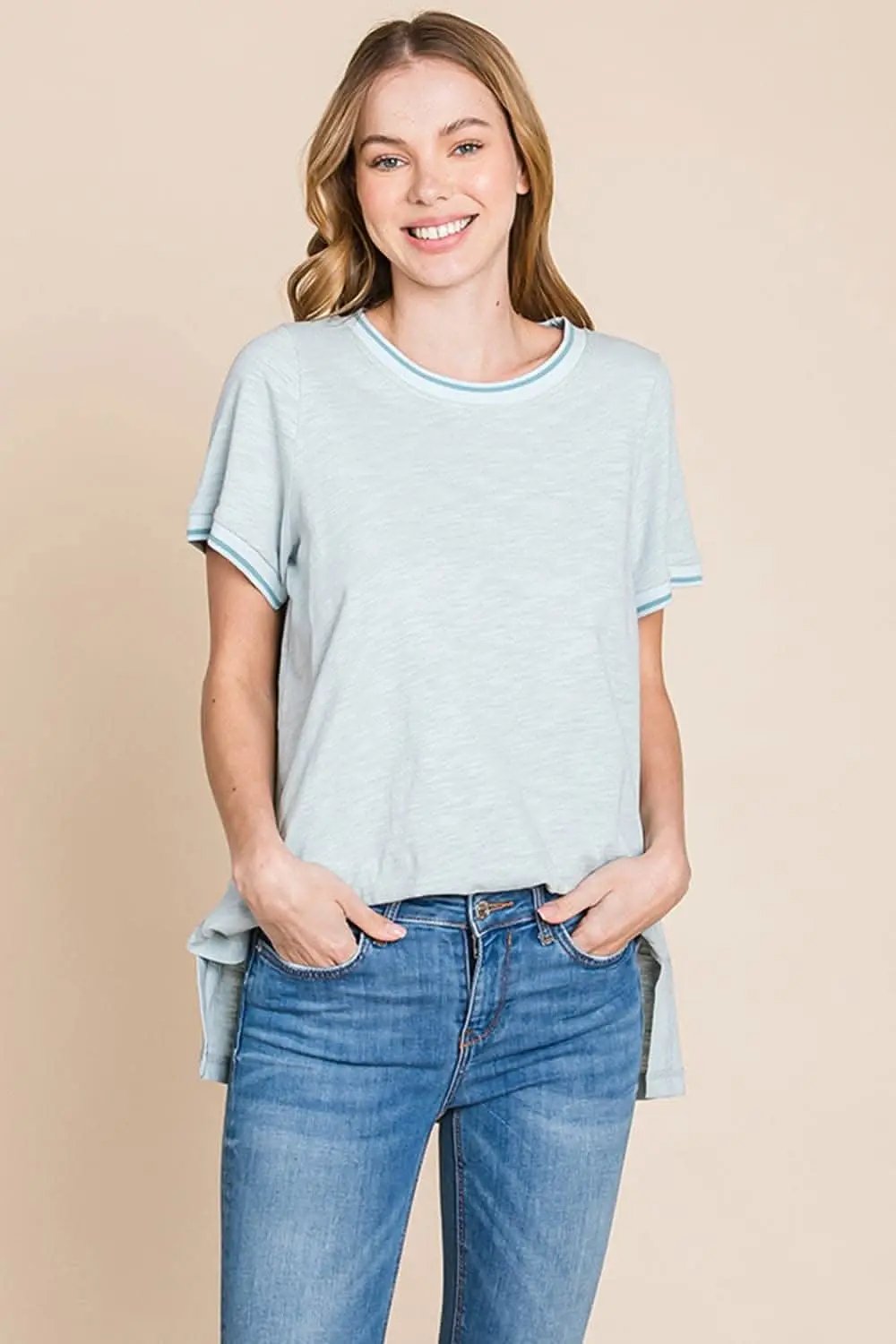 Trendsi Cotton Bleu by Nu Lab Contrast Trim Short Sleeve Slit T‑Shirt