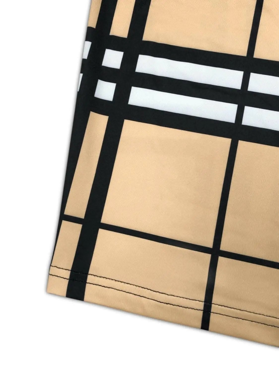 - Pattern and color: tan base with black and white plaid