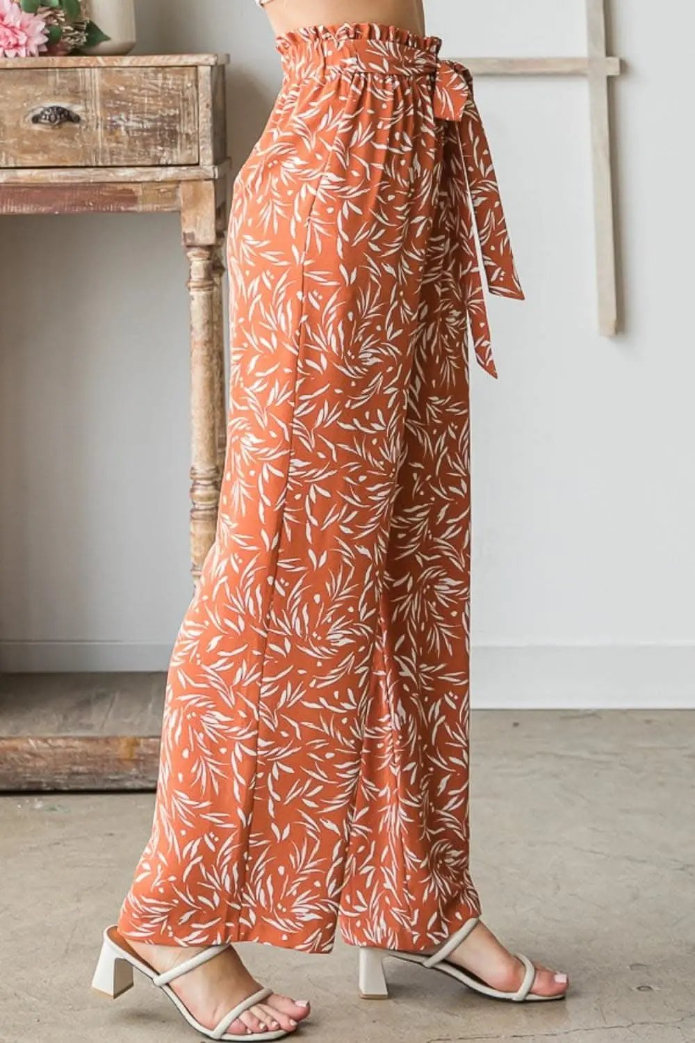 Elevate everyday style with the Heimish Full Size Printed Tied Straight Casual Pants. Made from durable 100% polyester, these pants feature a rust-orange botanical print and a self-tie belt at the elasticized waist for adjustable comfort.