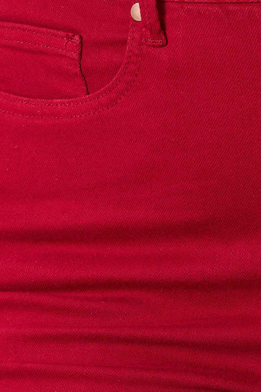 Color: red. These jeans pair with a variety of tops and footwear, suitable for casual days or more polished outfits.