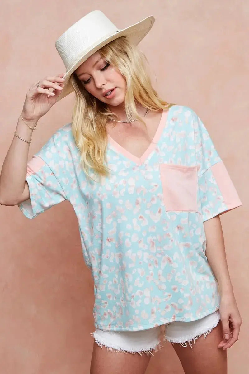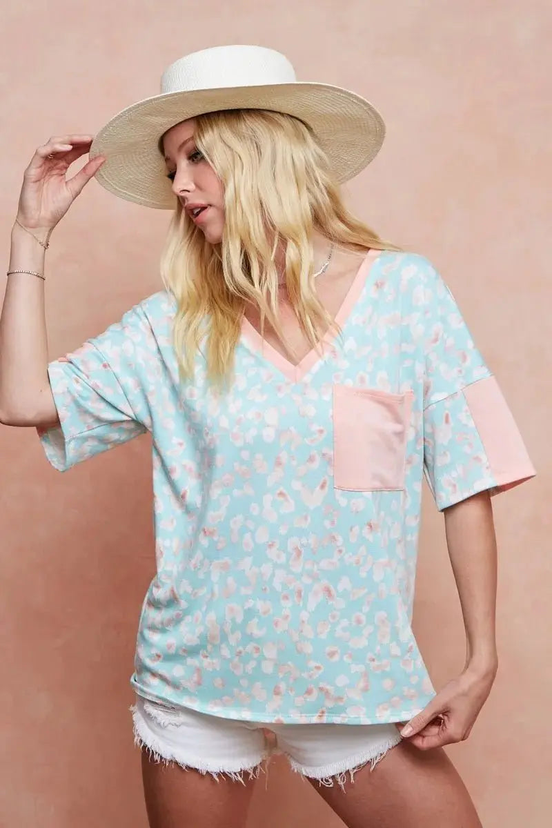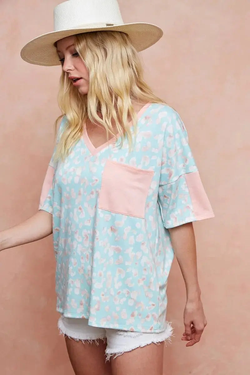 The design showcases a multi-color leopard print for a contemporary accent and includes a front pocket for functional style. This relaxed-fit T-shirt pairs easily with denim, joggers, or casual skirts, making it a versatile staple for everyday wear. Available in sizes S, M, L, and XL to fit a range of silhouettes.