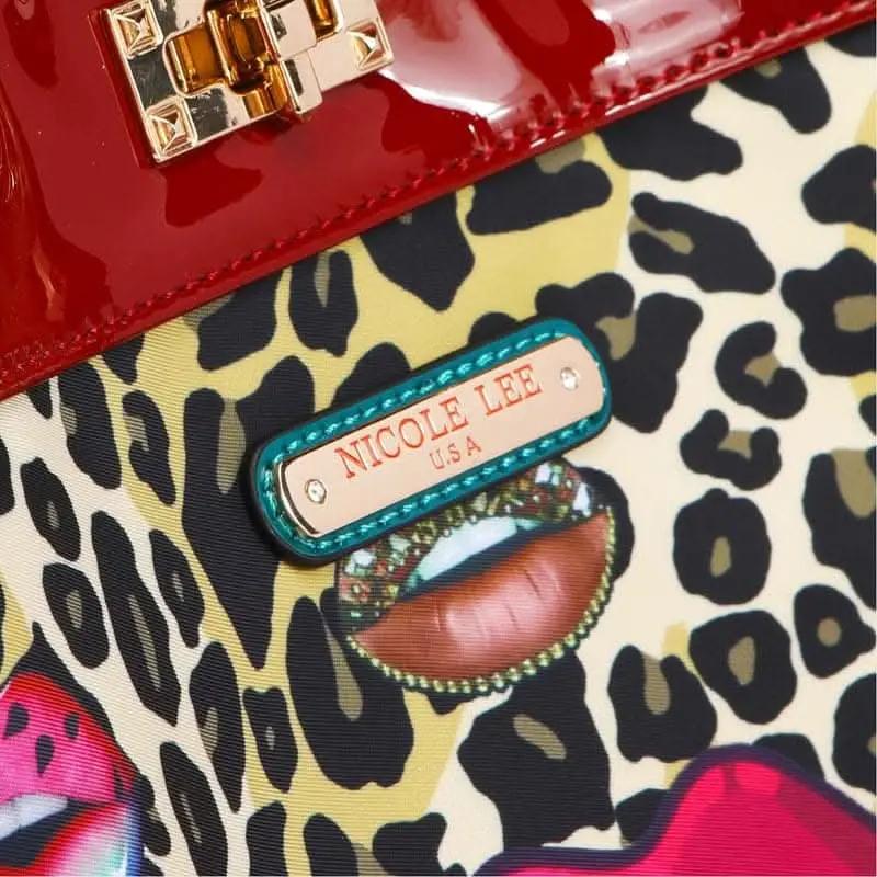 Durable nylon construction and a medium size deliver everyday practicality with a bold, fashion-forward look. The exterior features a leopard print fabric accented by a red patent-style top panel and metallic hardware.