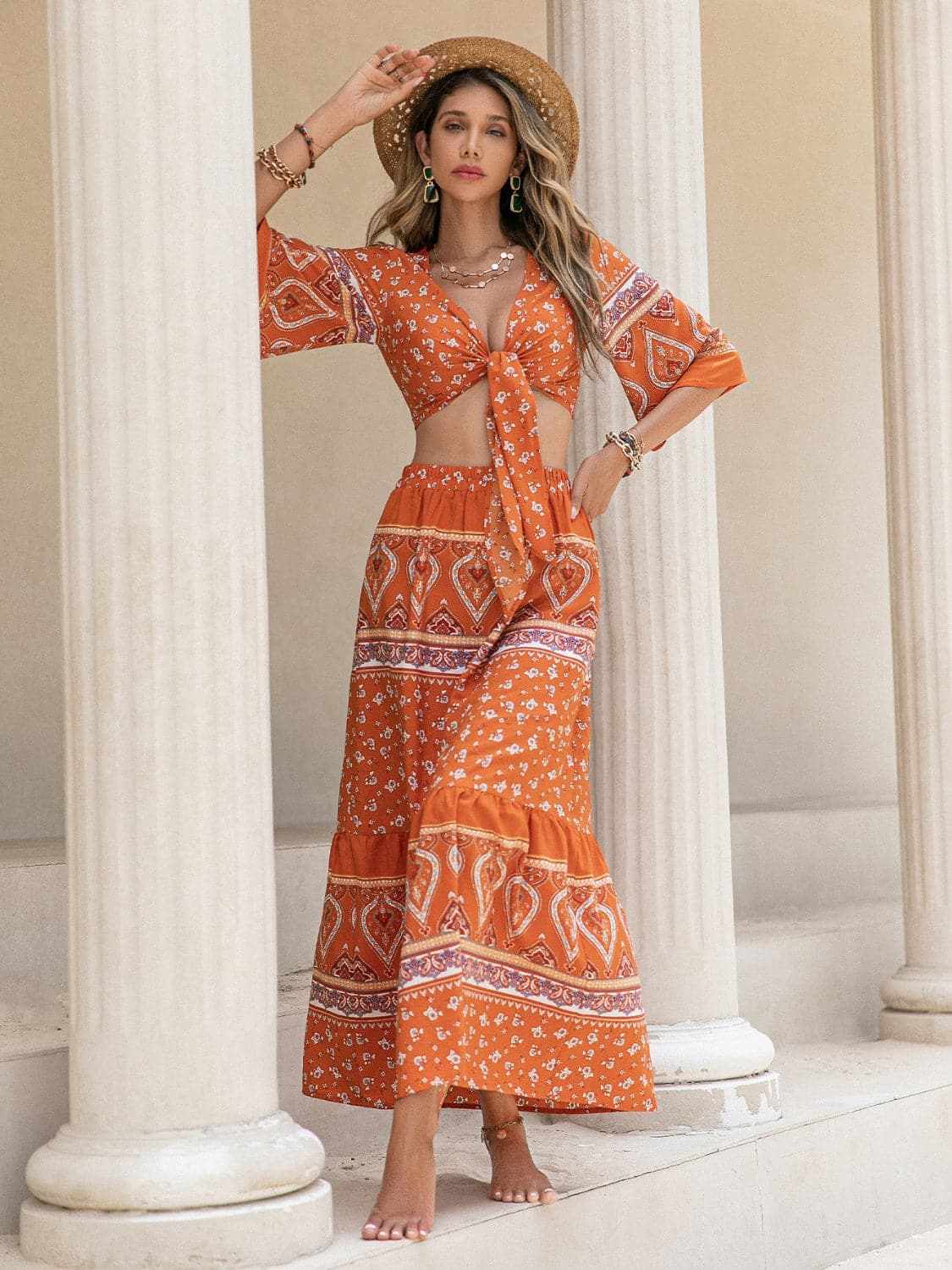 Top: a tie-front detail creates the dramatic neckline while half sleeves provide polished coverage. Skirt: a maxi-length silhouette drapes fluidly with a relaxed waist for comfortable wear.