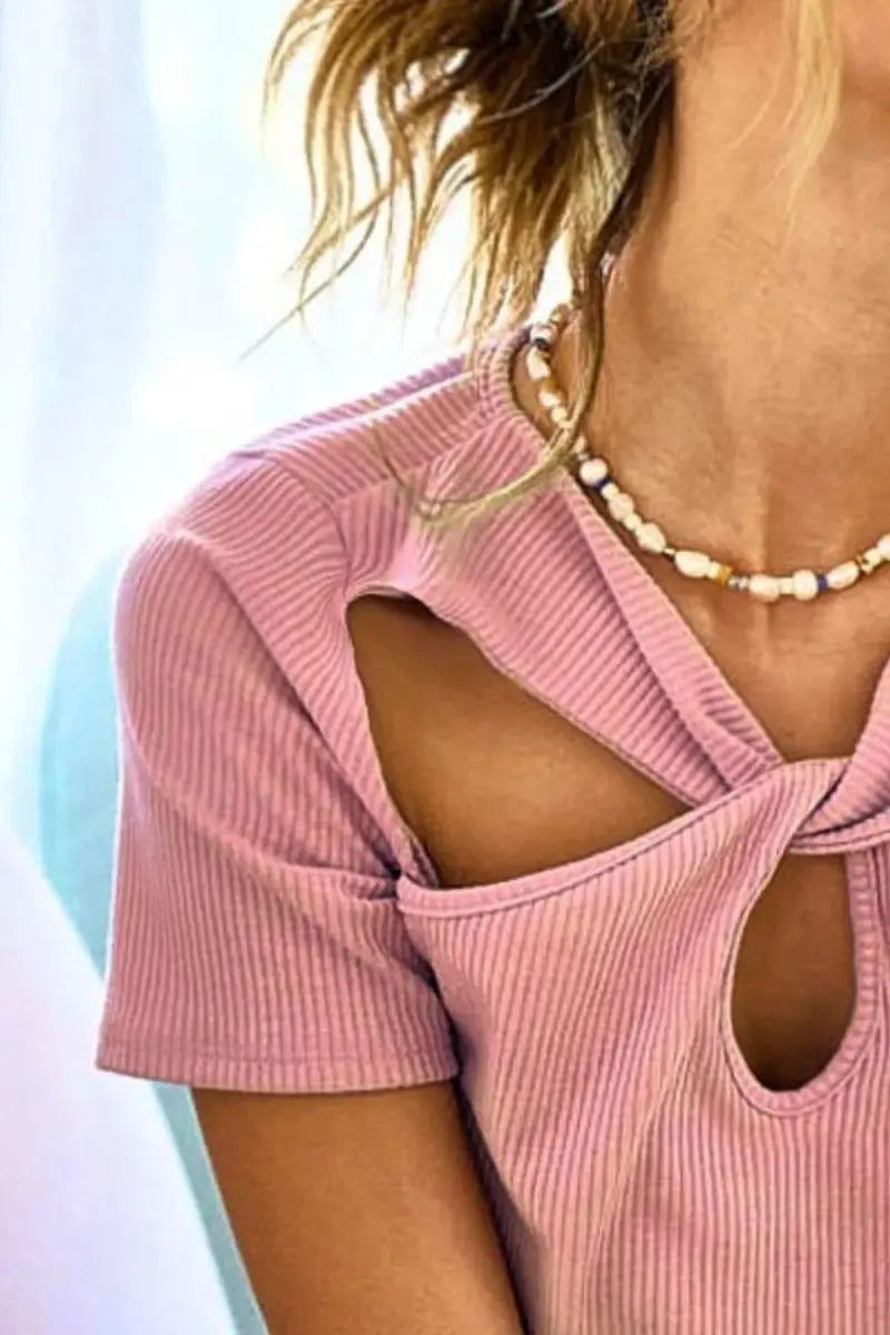 Trendsi Rib Knit Cutout Top Women's Casual Tee Front Twist, USA Ship