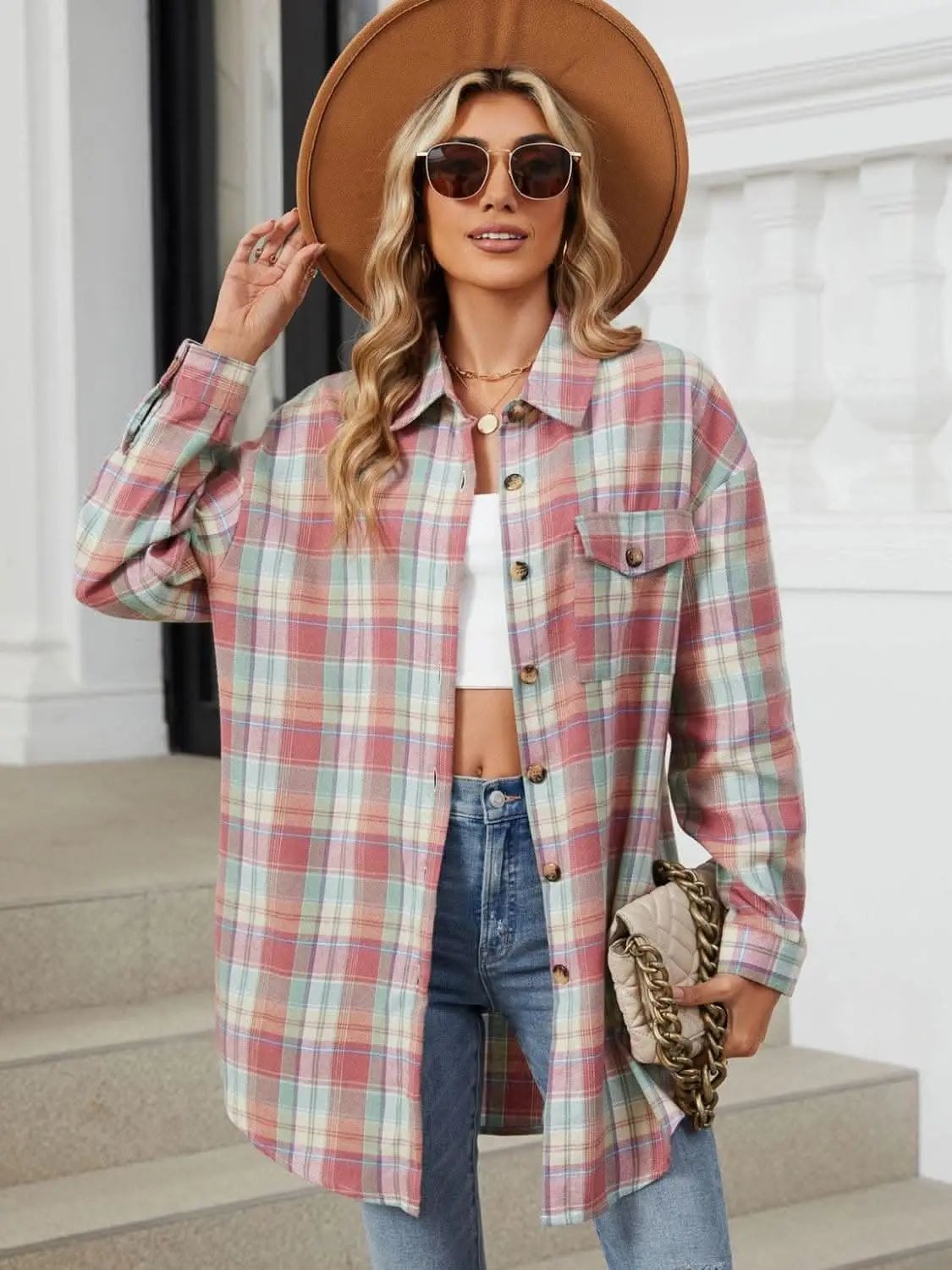 Designed for versatile styling, the Plaid Collared Long Sleeve Shirt from Trendsi features 100% rayon for a soft, opaque drape. The pastel plaid pattern adds a timeless touch, with a classic shirt collar, button-front closure, and a single chest pocket with refined stitching.