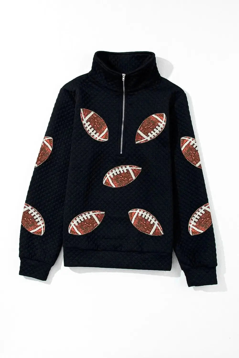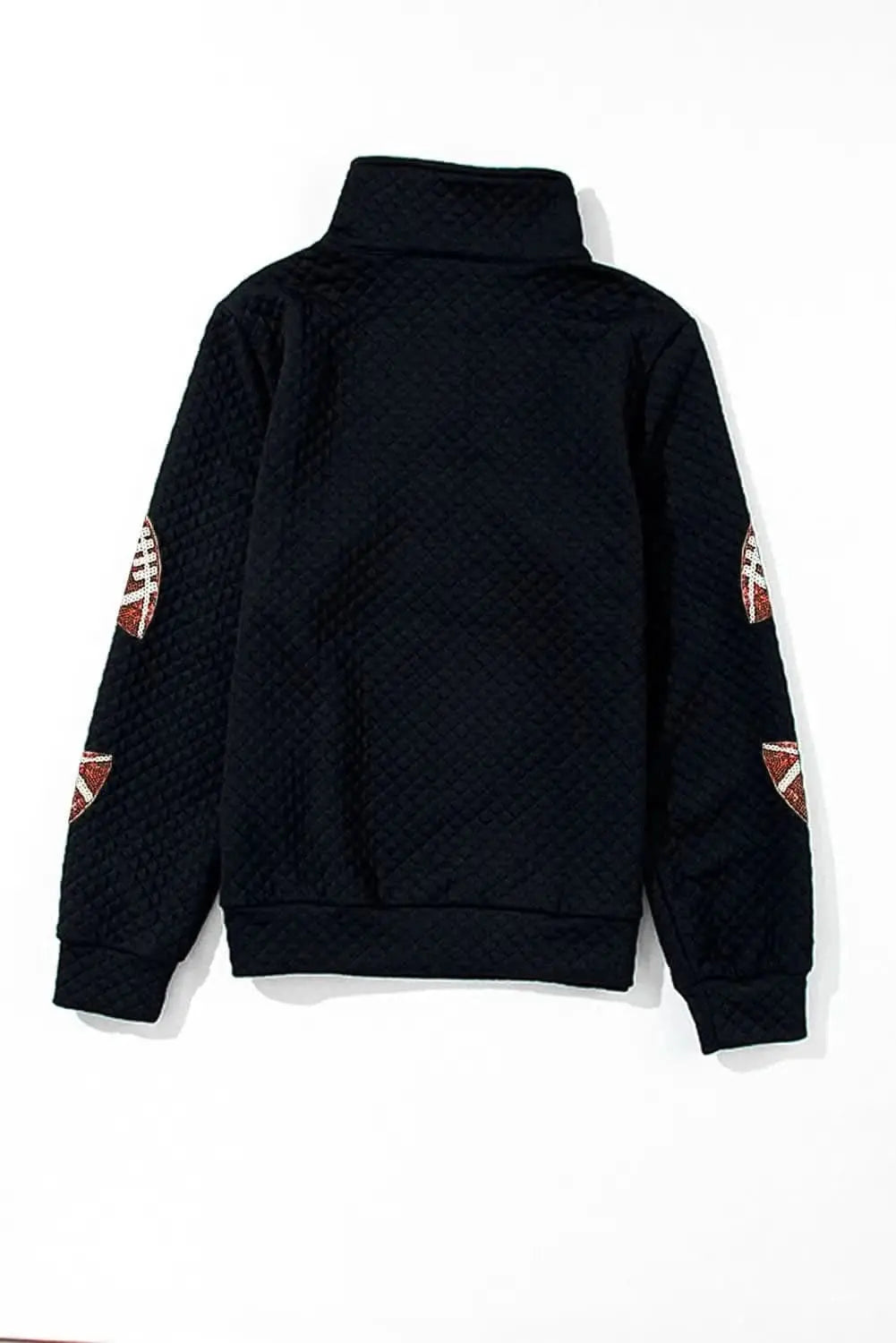 Elevate your wardrobe with a black quilted knit top that features sparkling sequin details for a glamorous touch. The front and sleeves showcase sequined elements designed to catch the light, creating a refined look suitable for both day and night wear. A quarter-zip neckline adds a contemporary feel and easy layering options, while the opaque stretch fabric ensures a comfortable fit.