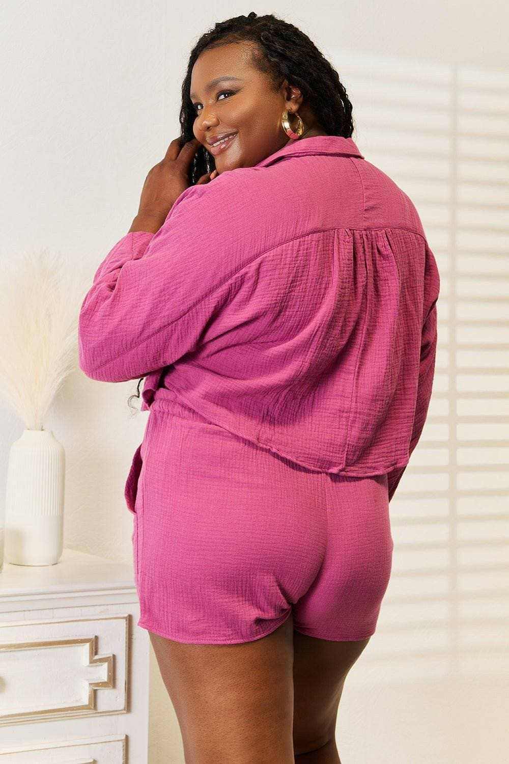 The relaxed fit ensures ease of movement and a comfortable feel throughout the day, while the breathable fabric makes it an ideal choice for warmer weather or layered styling. Whether you pair the pieces together for a cohesive look or mix and match them with other items in your closet, this set offers endless styling possibilities. The top can be worn open over a camisole or buttoned up for a polished finish, while the accompanying bottom piece (e.g., a matching cami or a short-sleeved top) completes the chic aesthetic.