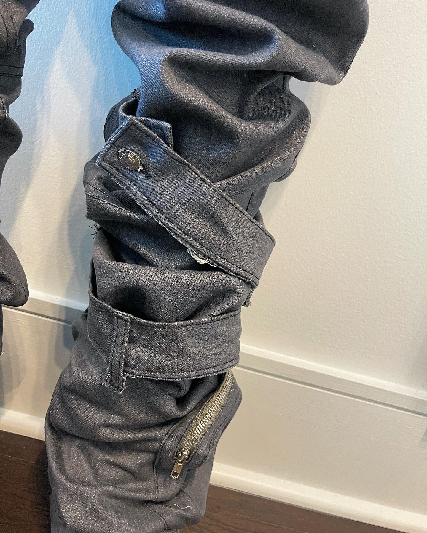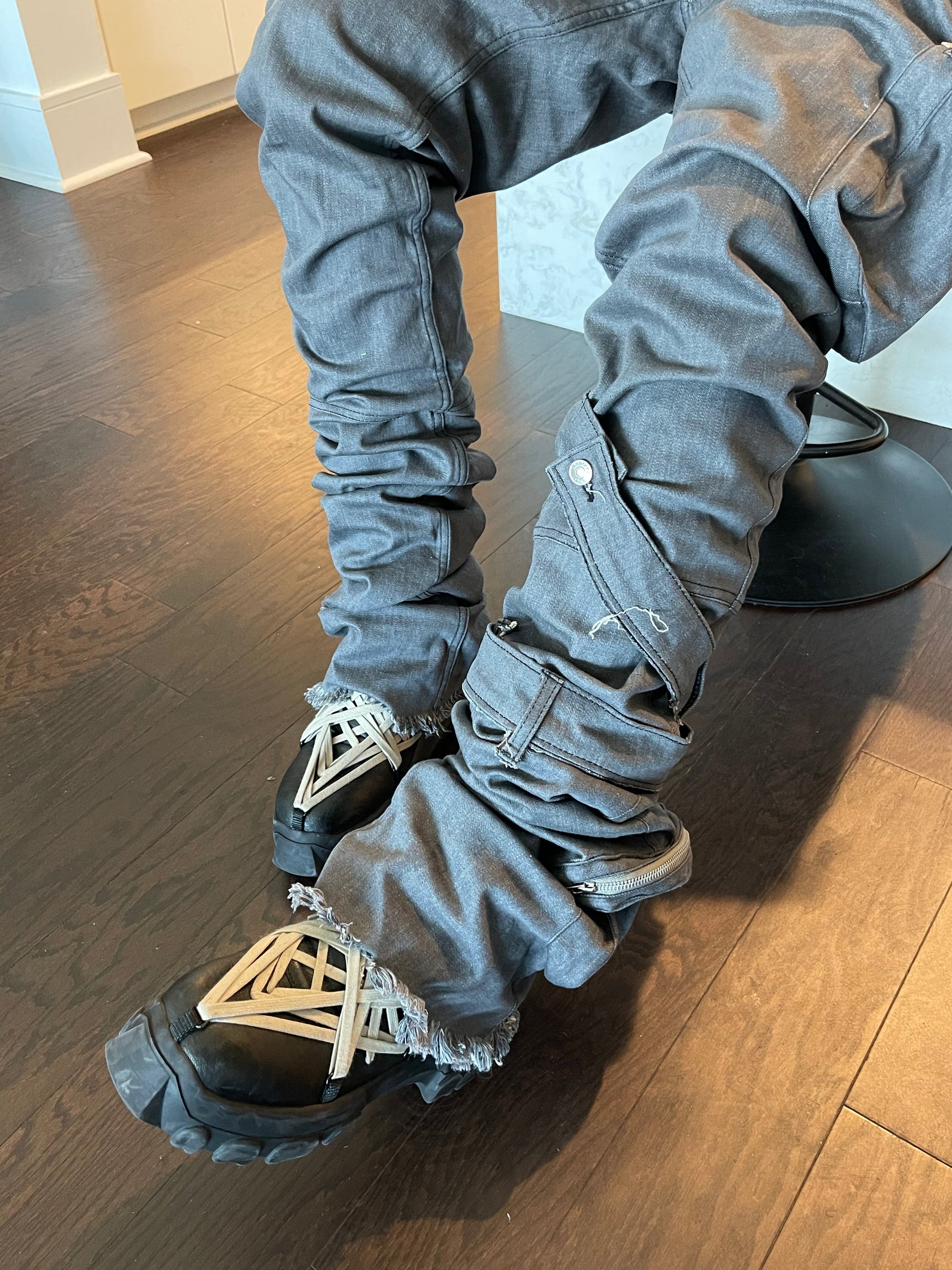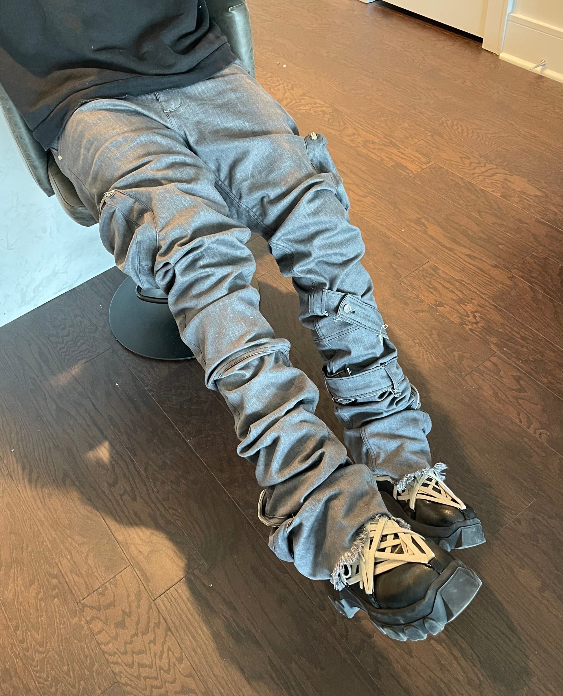 Vintage Gray Stacked 3D Cargo Denims w/ Shin Belt