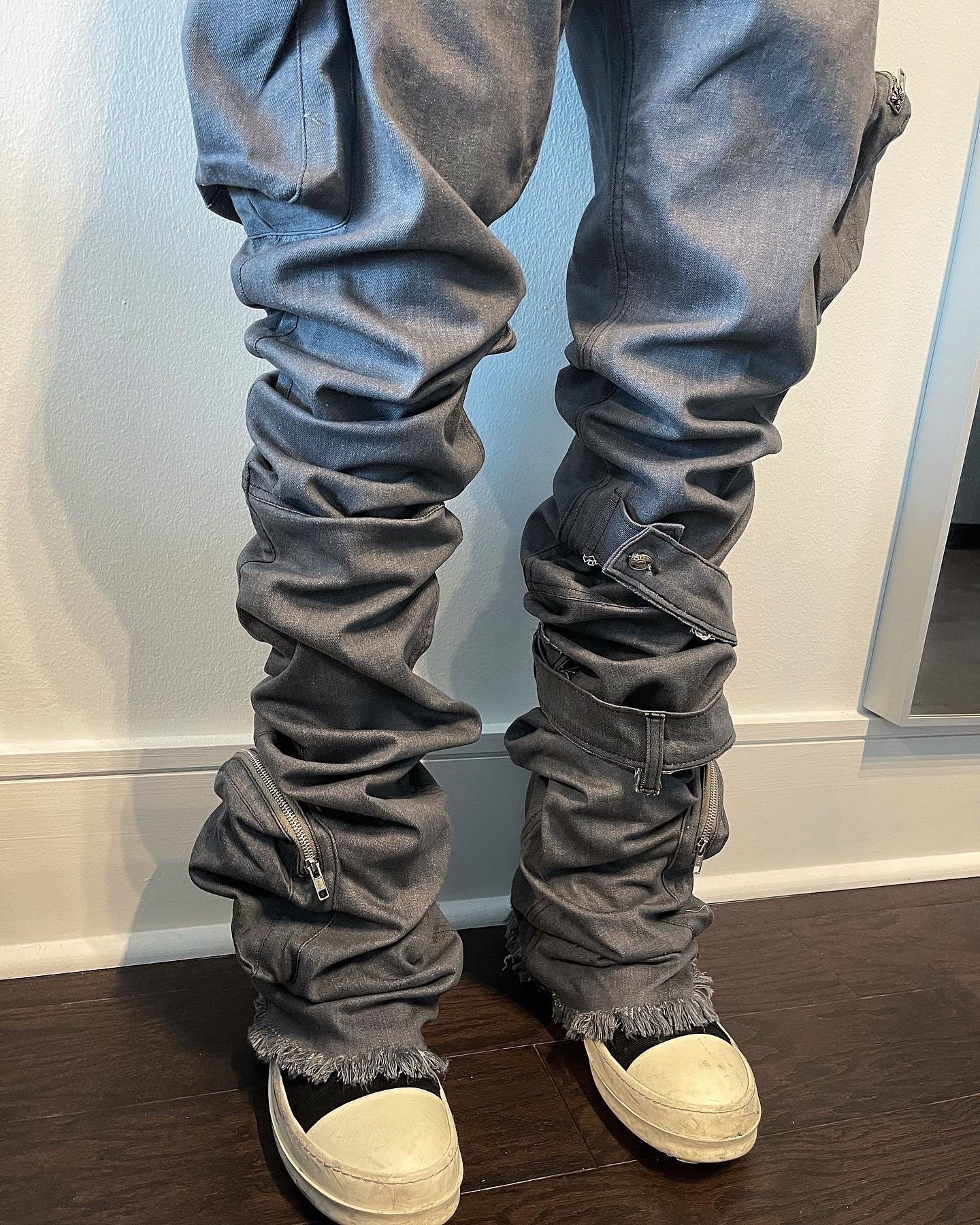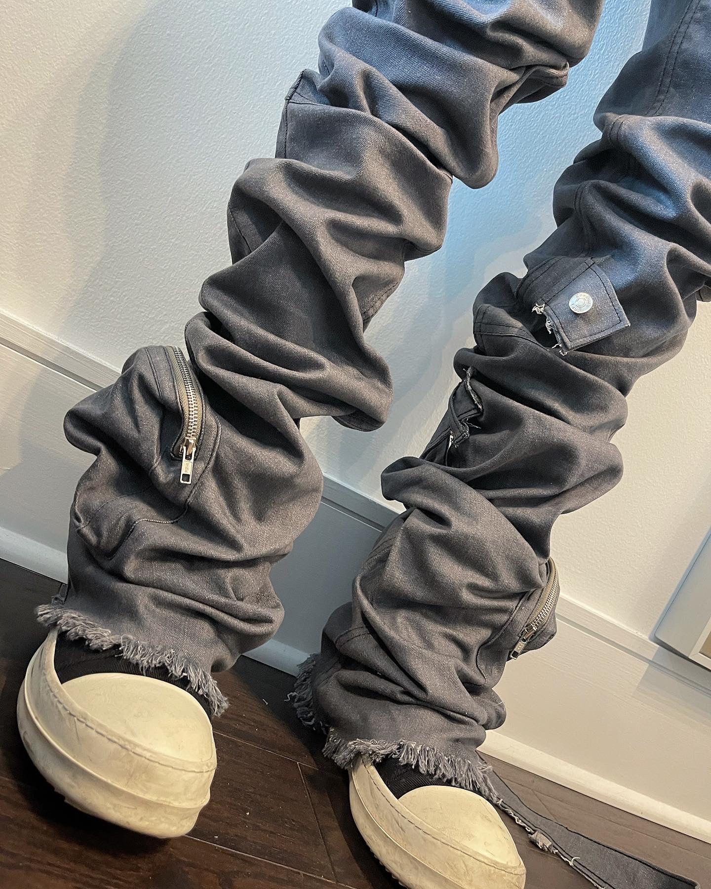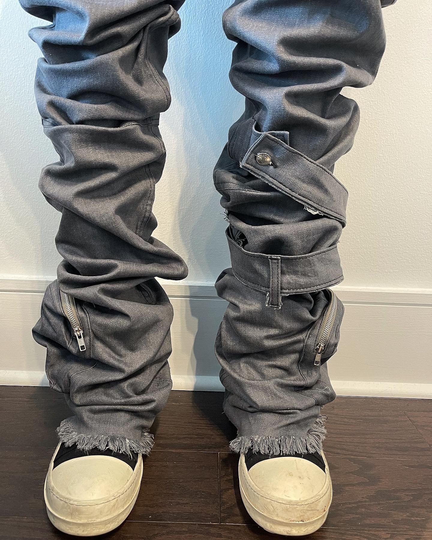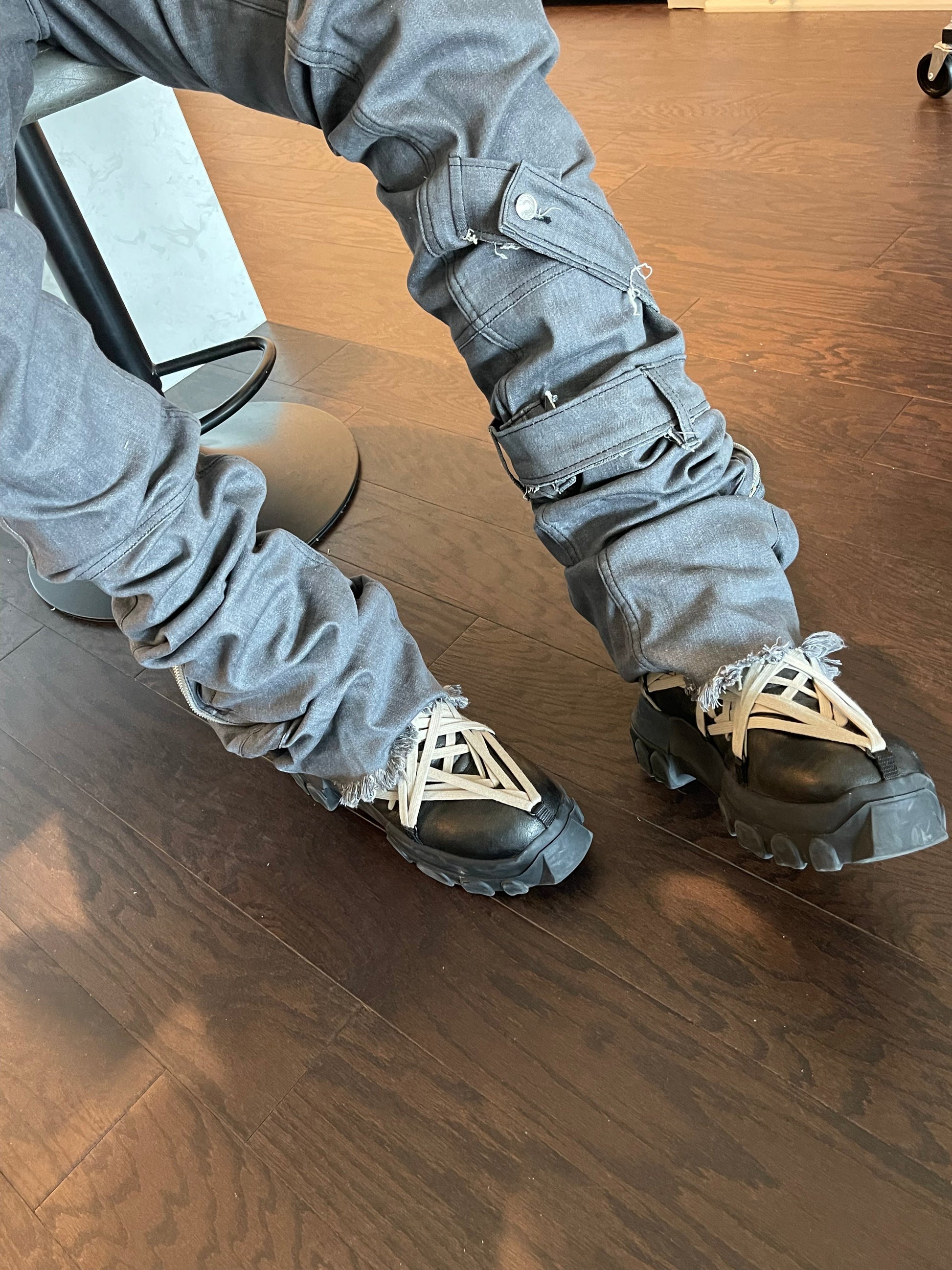 Vintage Gray Stacked 3D Cargo Denims w/ Shin Belt