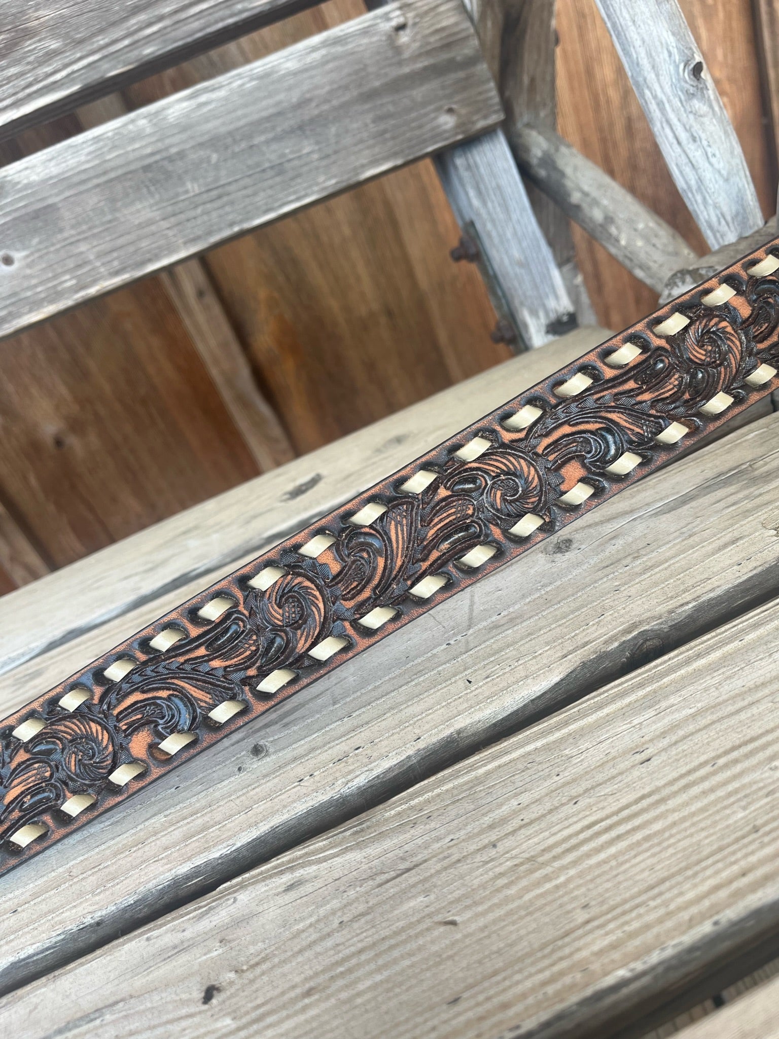 Women's 11/2" belt featuring a vintage Whirlwind tooling design and cream buck stitching.