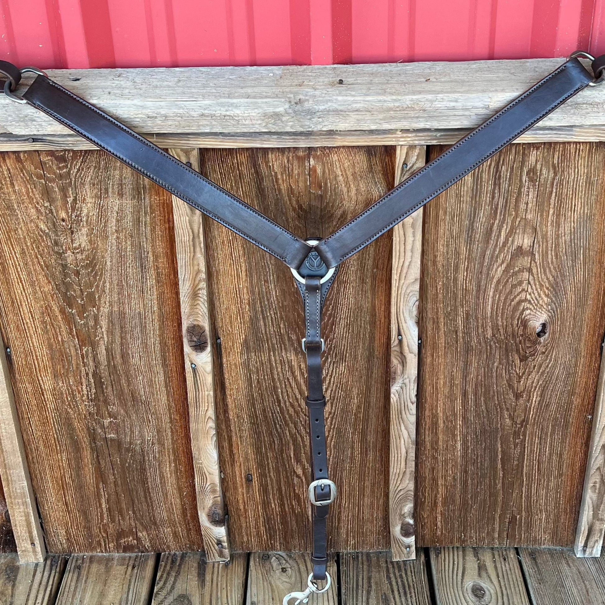 Plain walnut color Reinsman breastcollar with silver D rings and silver clips