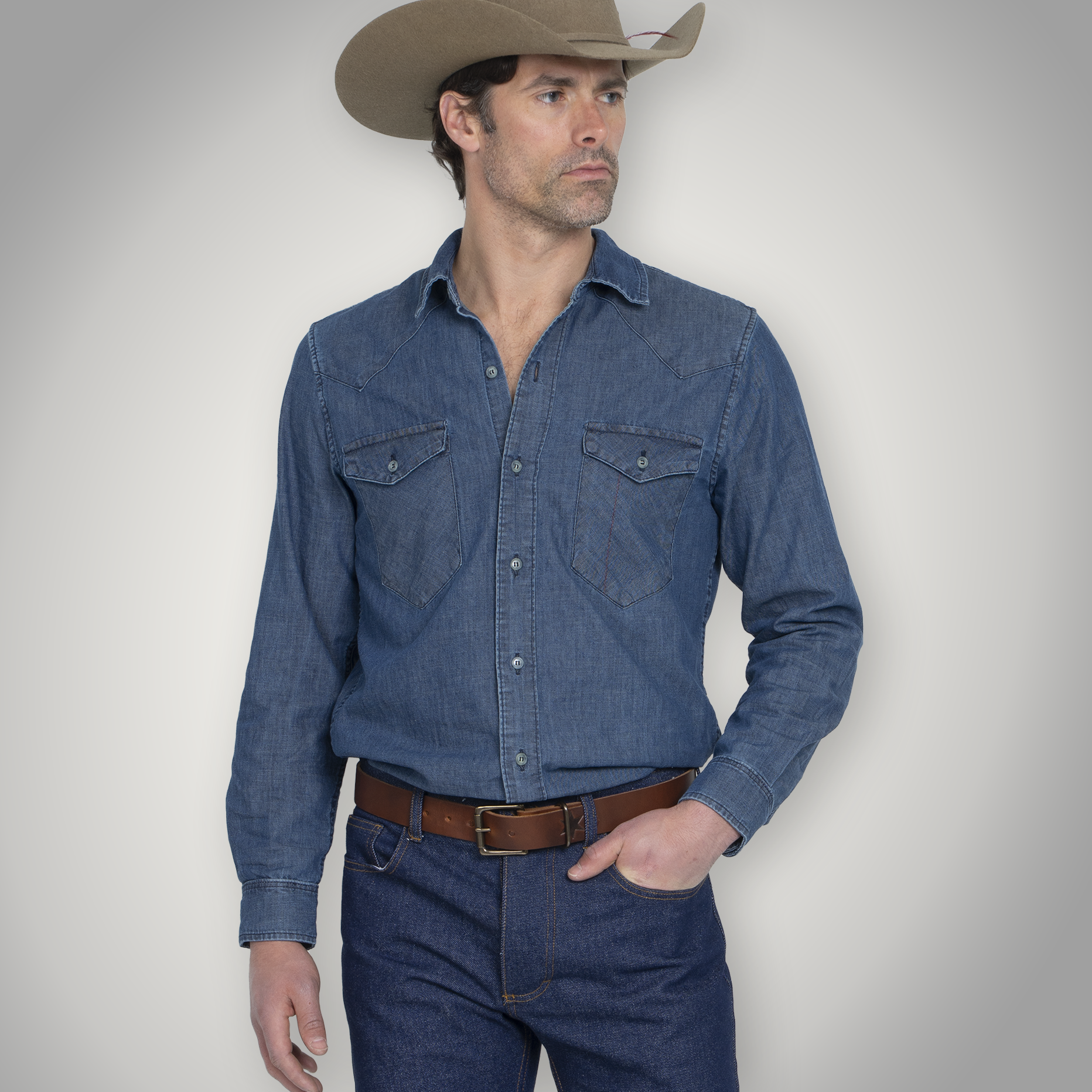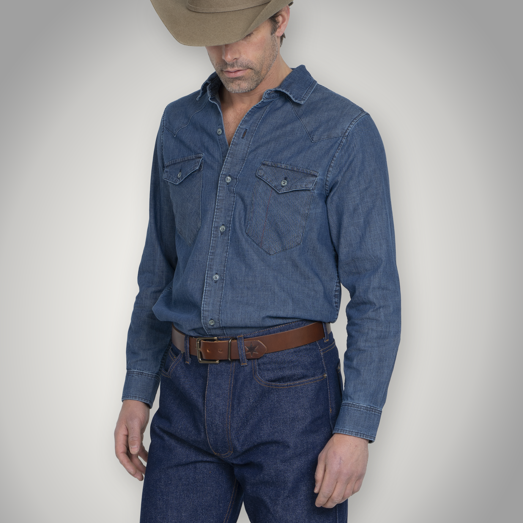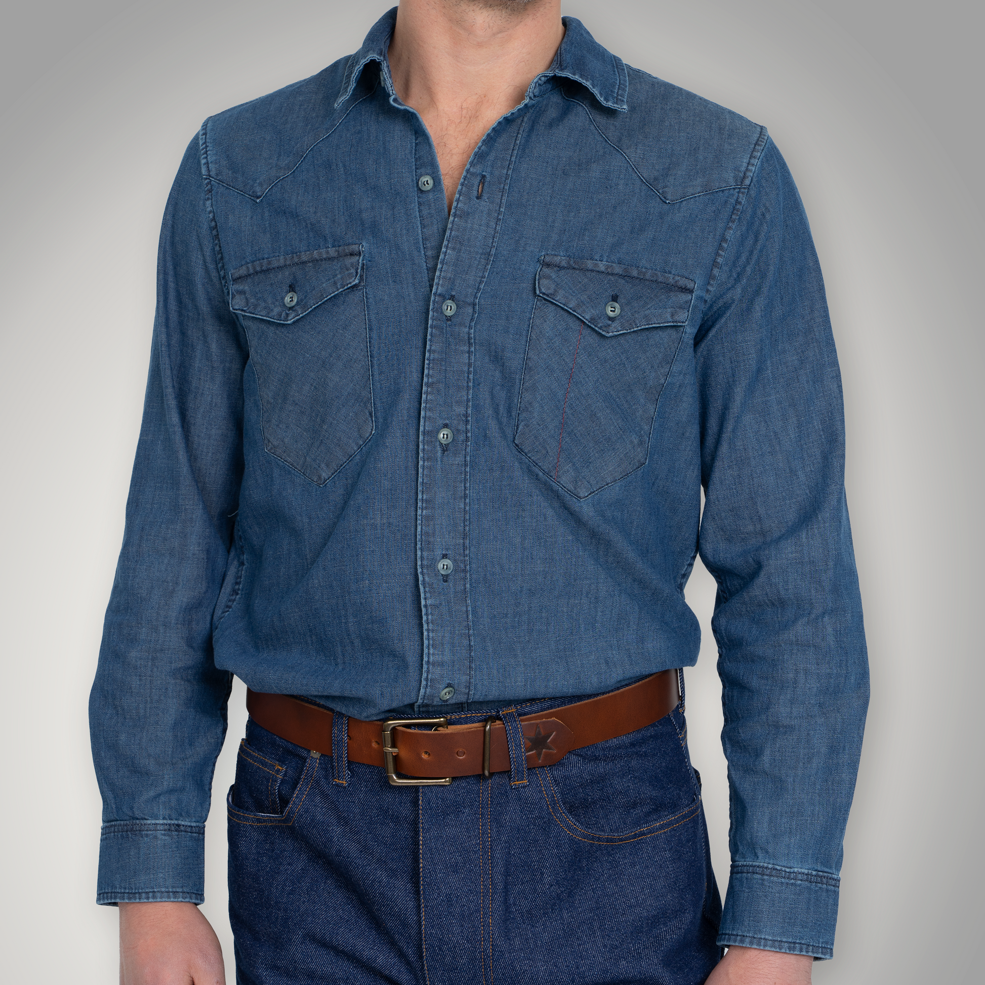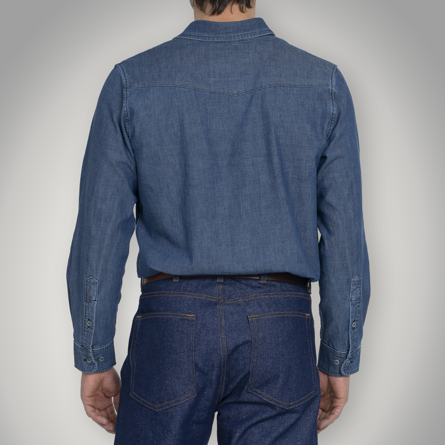 100% Cotton Chambray. Two button pockets. Asymmetric accent stitch. Center box pleat at back.