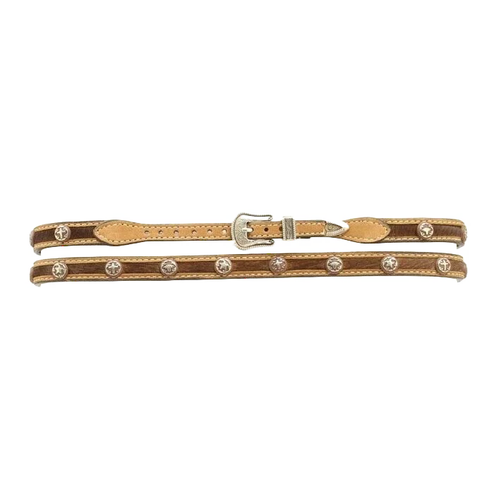 Genuine leather calf hair inlayed hat band with silver western conchos. This style hatband uses a belt style adjustment with a rounded silver buckle. Medium Brown Distressed