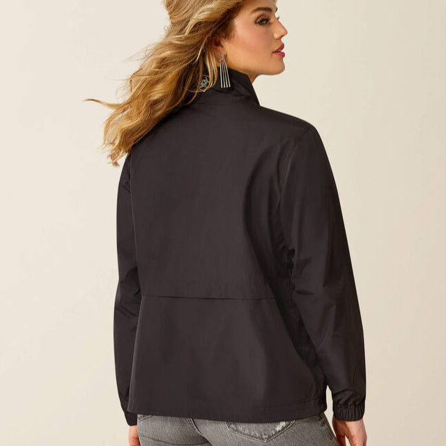 Women's Ariat black whisper pullover jacket. Water and wind resistant with a kangaroo pocket. Waterproof zippers, Elastic hem, Mesh lining, 100% Polyester.